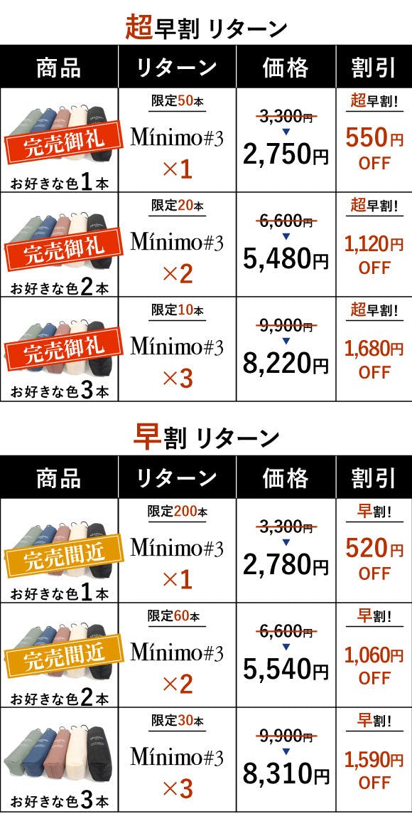 その第1弾となる Minimo#1「超小型自動開閉傘Minimo」は、CAMPFIREでも多くのご支援をいただき、現在も一般販売が続くロングセラー商品になっております。