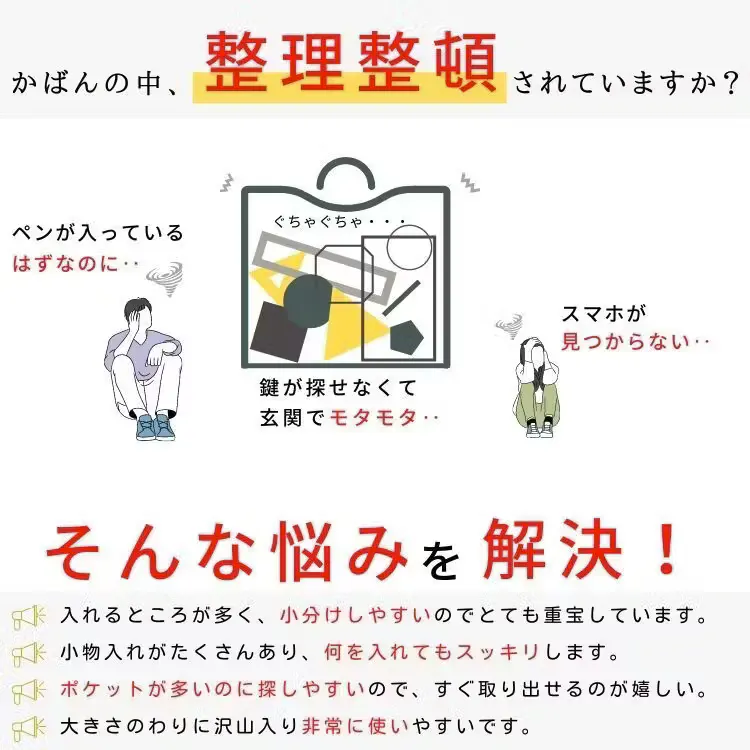 使い始めはポケットが多すぎて「どこに何を入れたか分からない!」と感じるかもしれません。しかし、使っていくと「財布はここ」「カギはここ」など自分だけの収納場所が固定され、もうカバンの中をあれこれ探すことがなくなります。