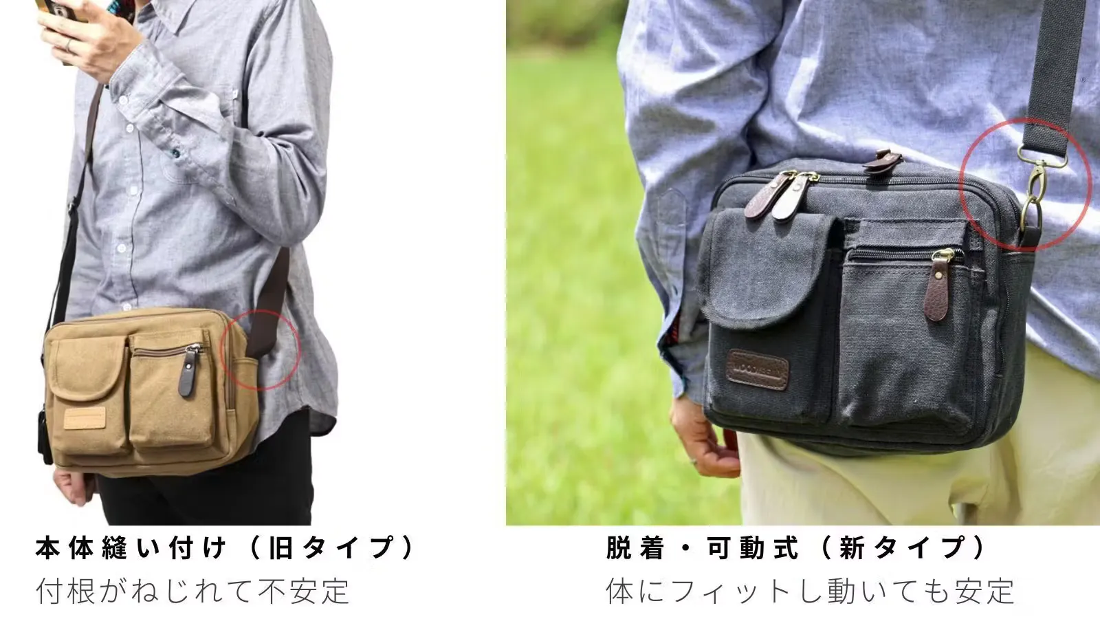 長さ調節可能で身長問わず、薄着でも厚着でも使いやすい位置に調節できます。