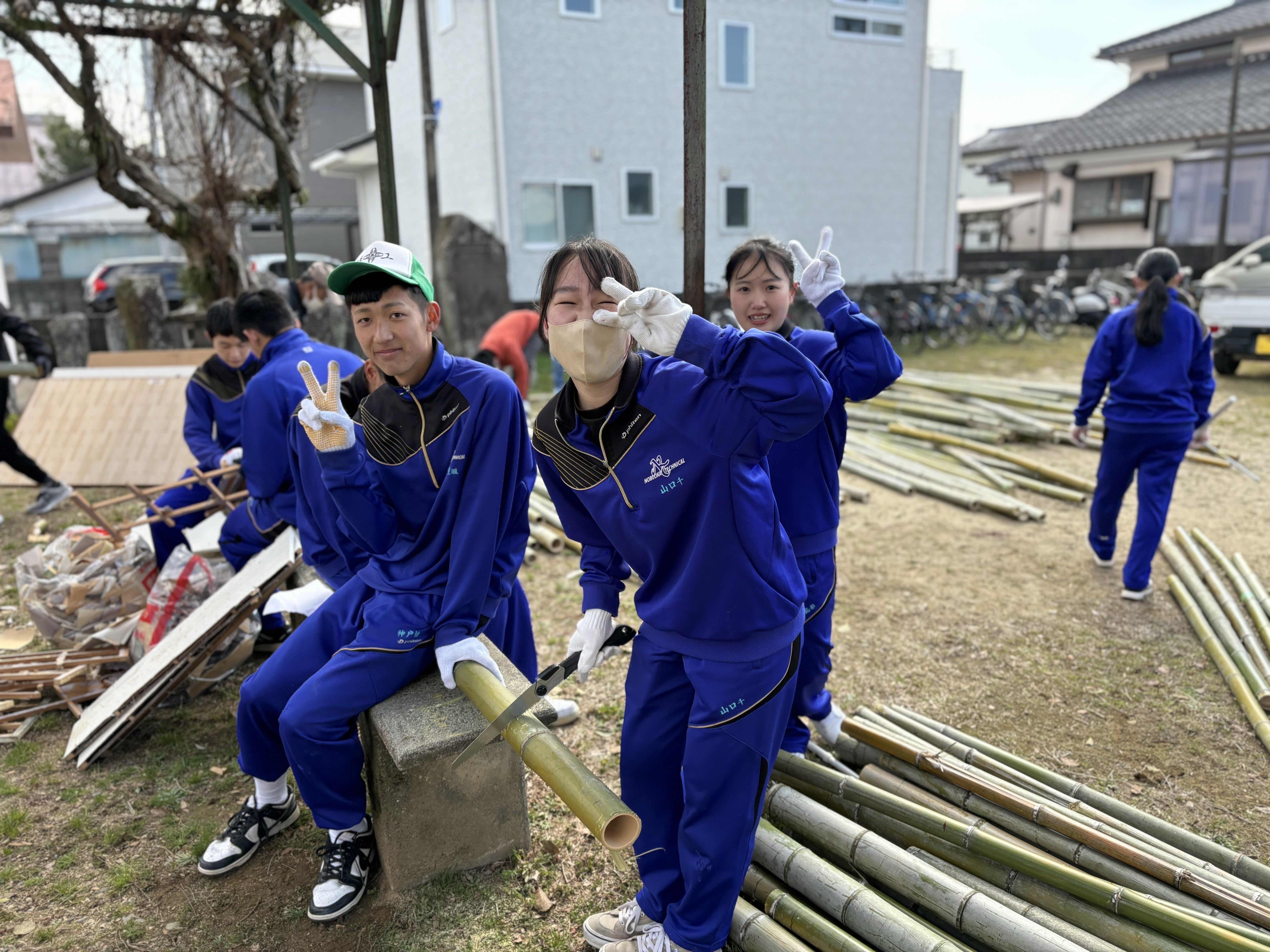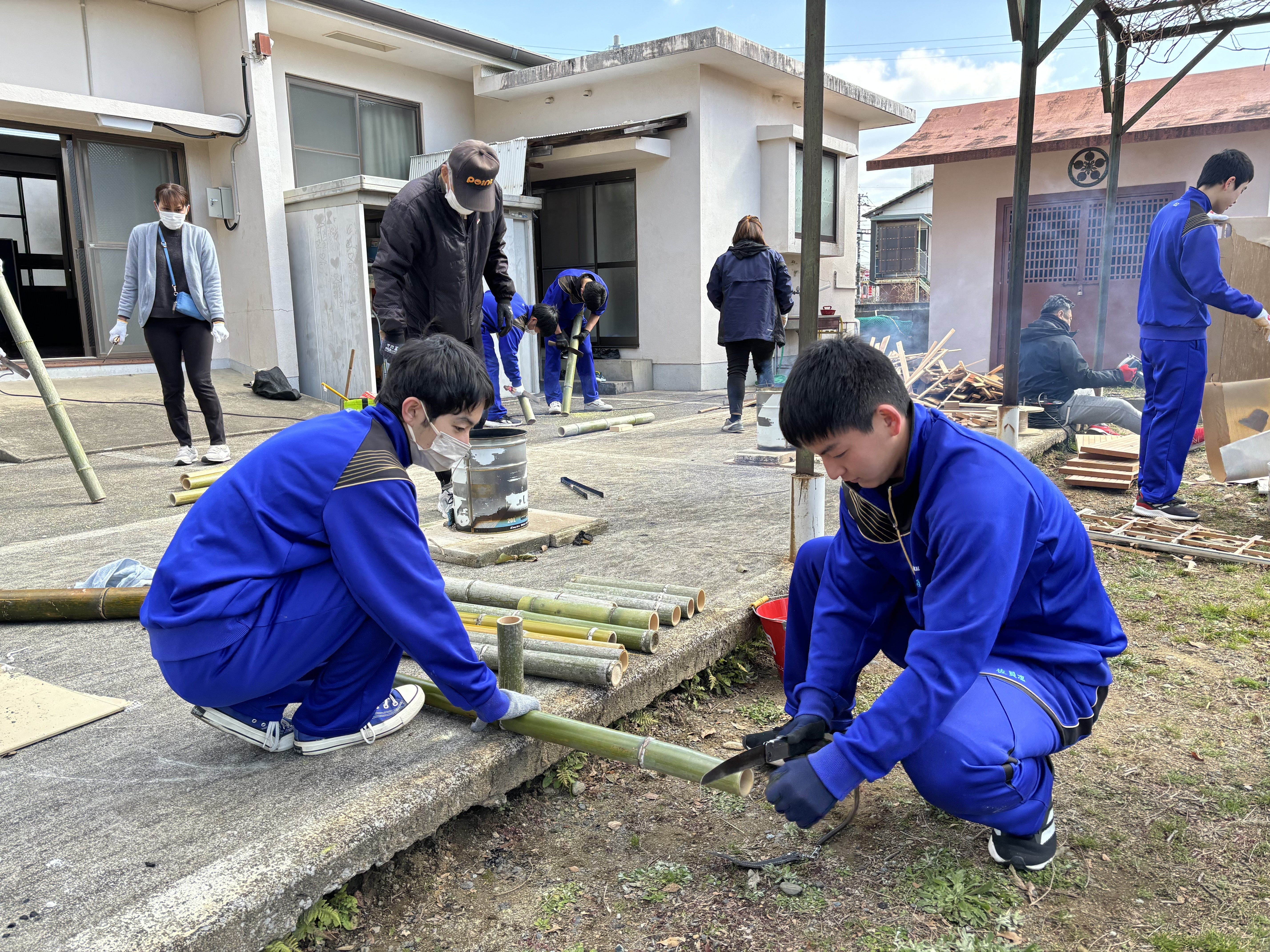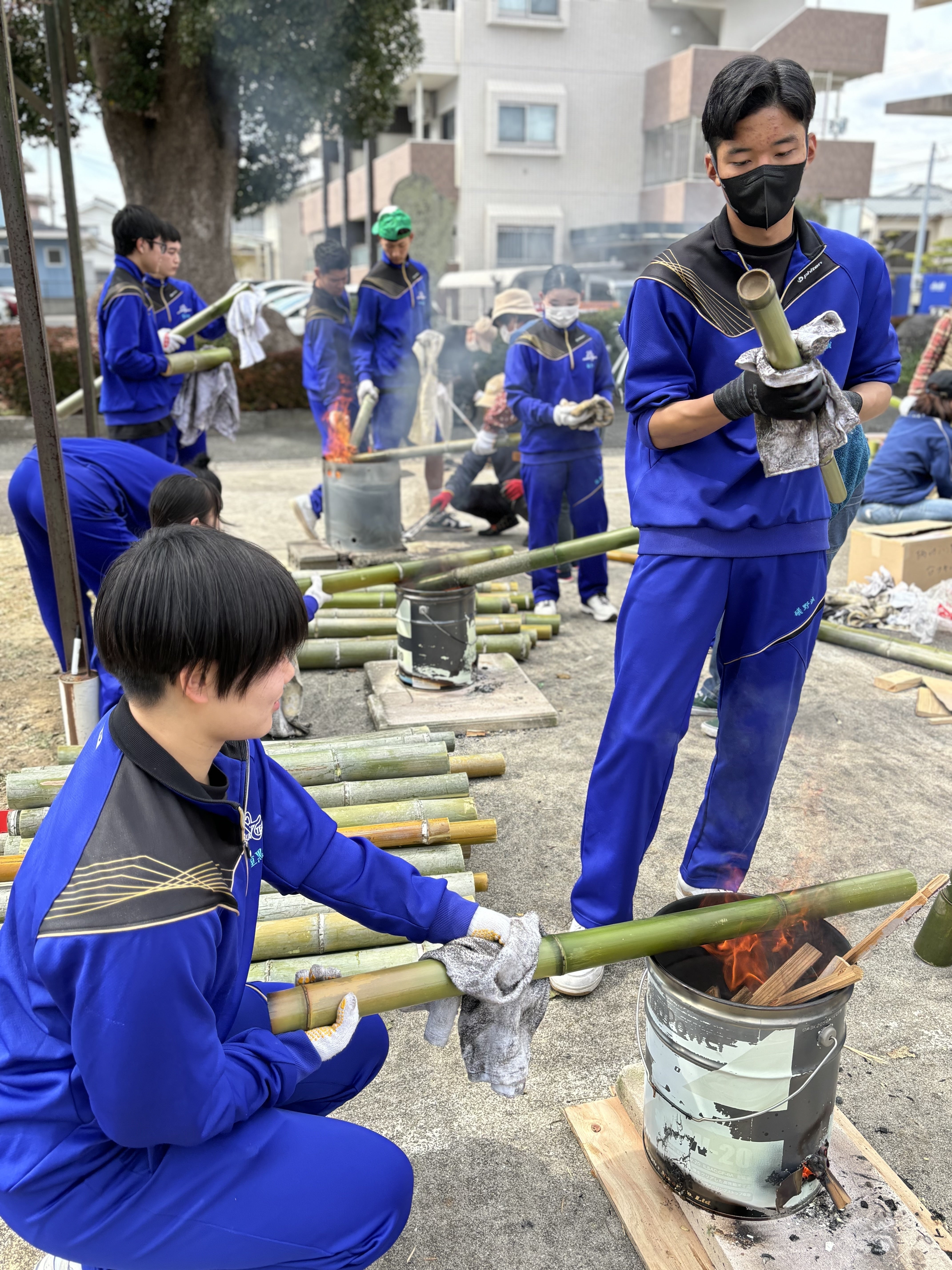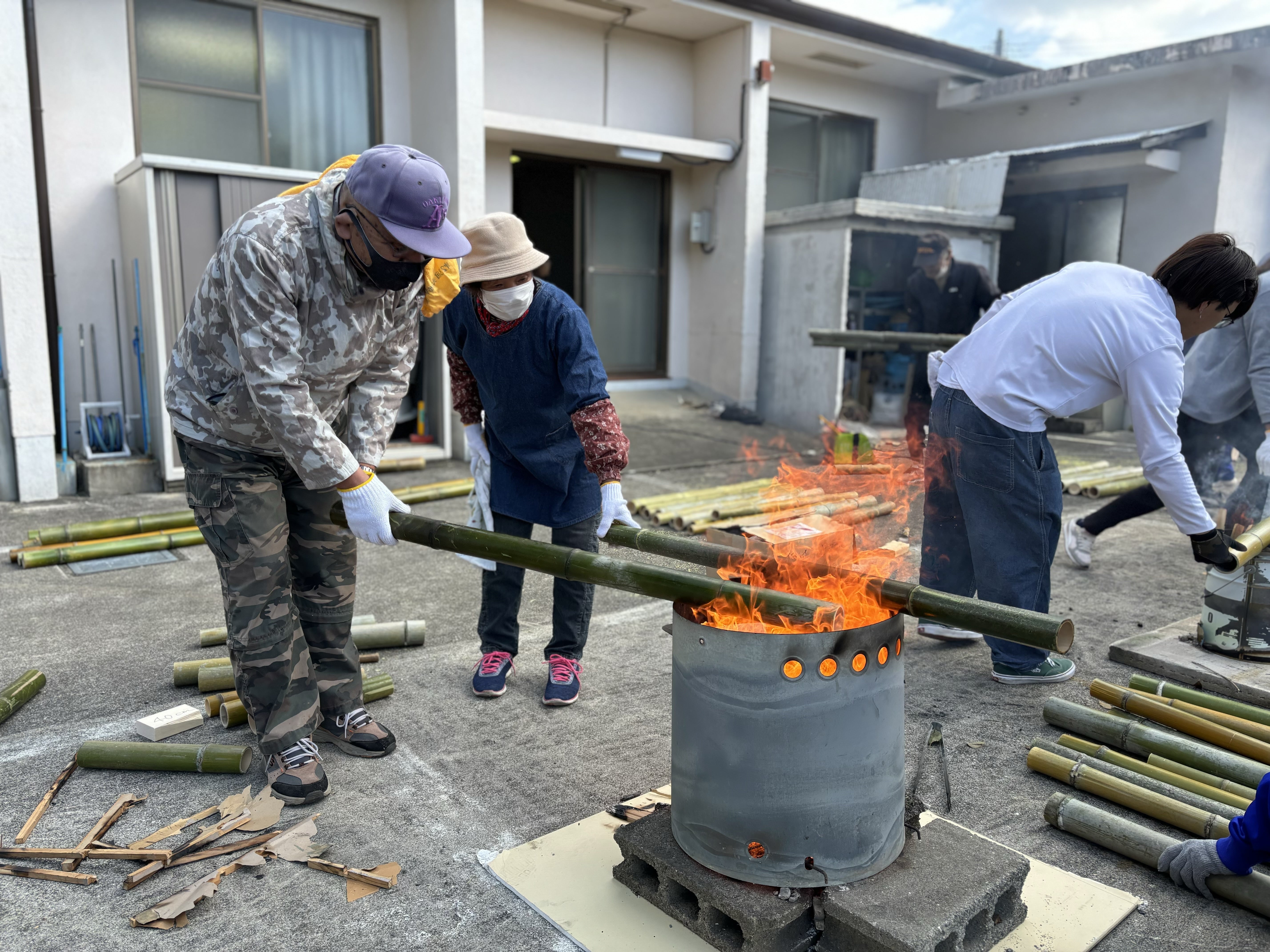 200本以上ある竹をそれぞれ必要なサイズに切って、火に炙って油抜き!とっても大変な作業で1日で終わるのかな…と心配していましたが、惣領町の皆さんの的確な支持と、高校生の元気なパワーでなんと全部完了ヾ(´∇`)ノ