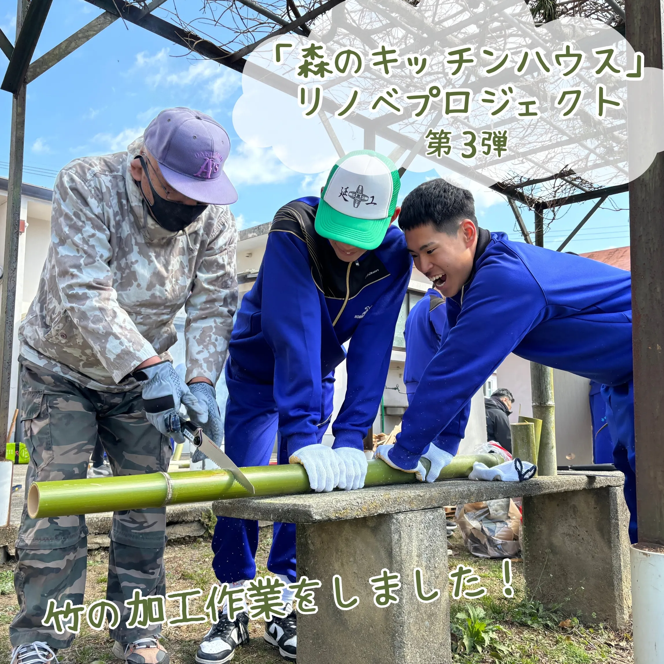 先日は惣領公民館で、前回伐採した竹を、延岡工業高校生と惣領町地区の皆さんに協力していただき油抜き・加工作業を行いました‼