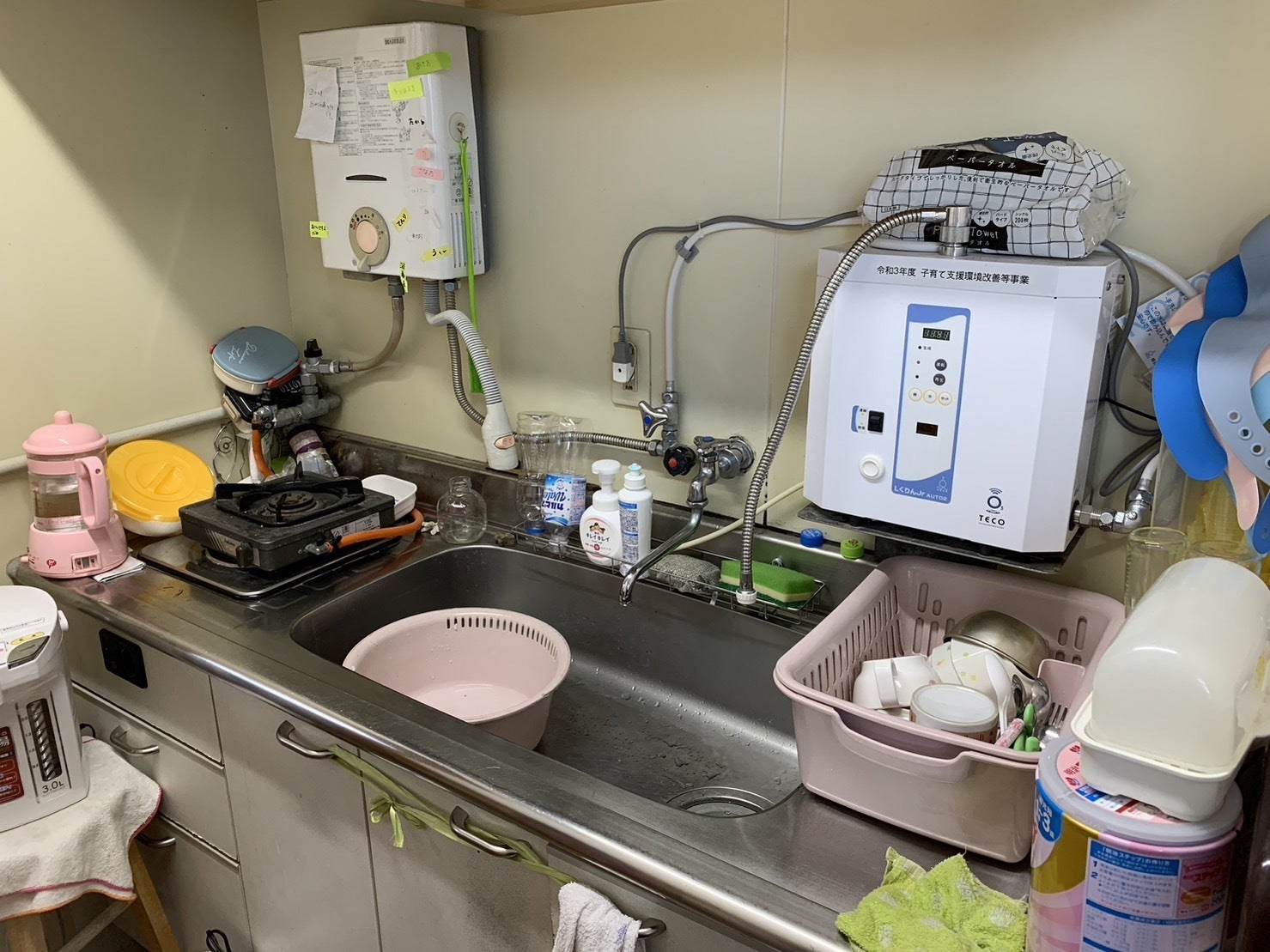 来所される際はお弁当を持参してもらうようになっていますが、最近では子ども達を緊急でお預かりすることなども増え、おやこの森で食事の準備をしないといけないことがあります。しかし、おやこの森にはこの狭い給湯スペースしかなく、できることといっても、レトルト食品やスーパーのお弁当を温めて出すことぐらいしかできません。