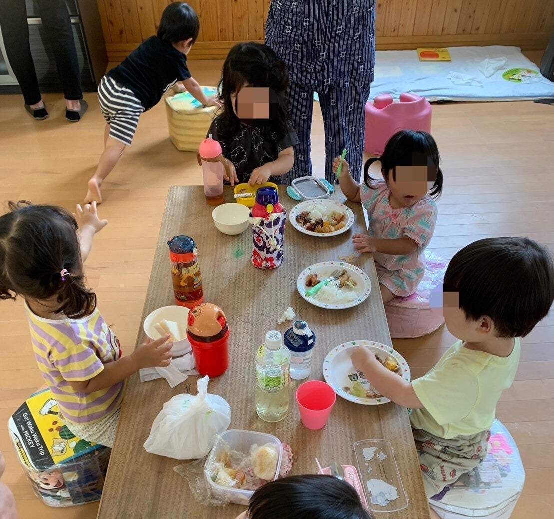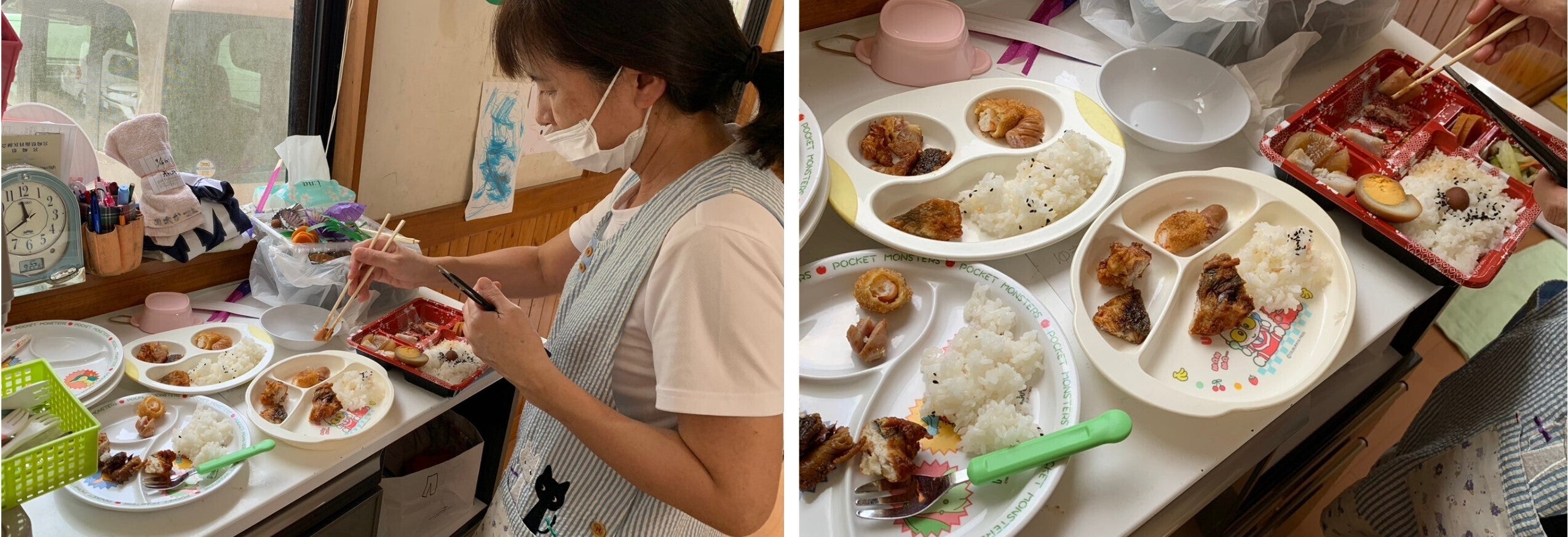 この日私が伺った時は、買ってきたお弁当を子ども達が食べやすいようにハサミで小さく切り分けて、子ども達に食べさせてくれていました。