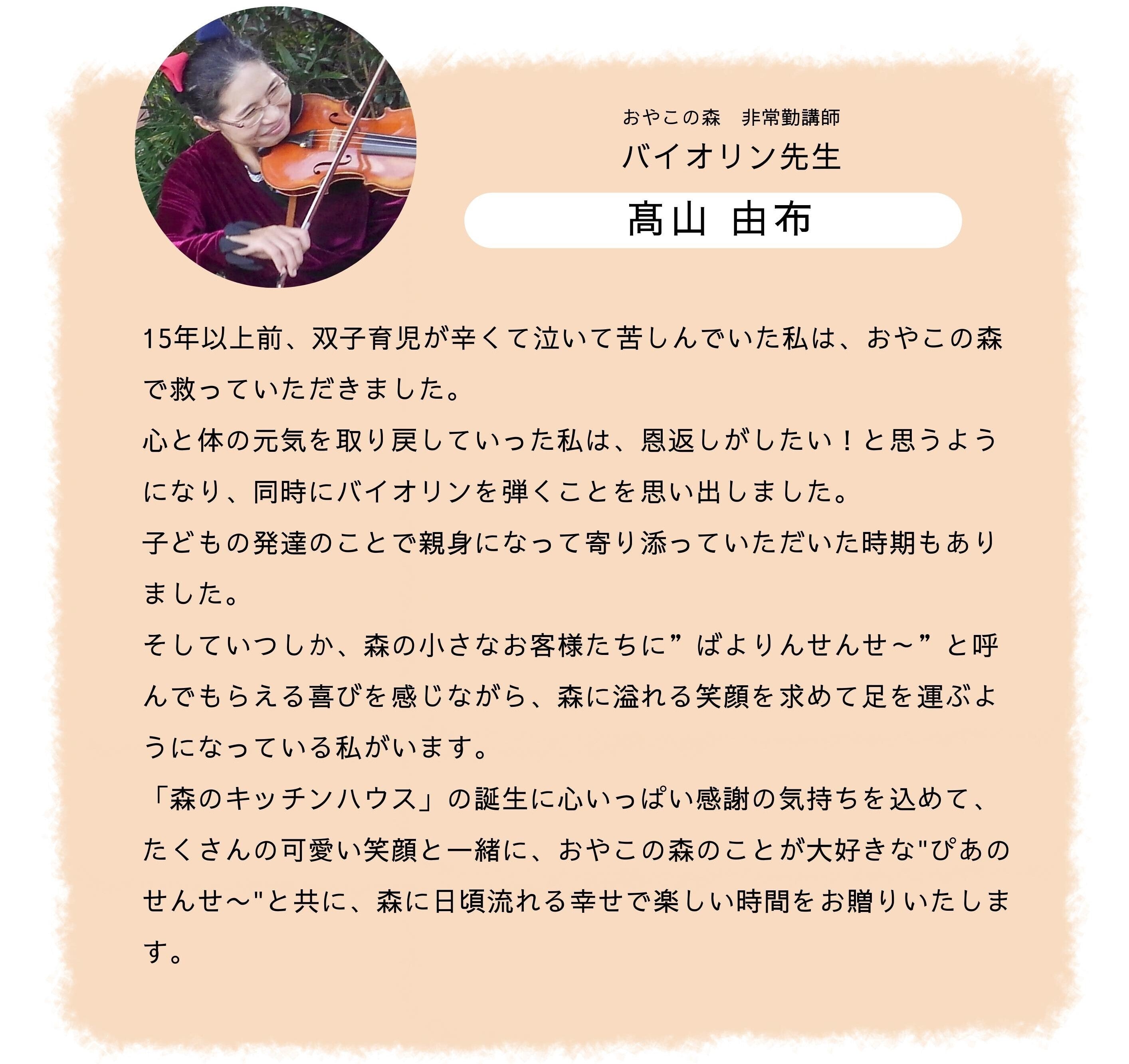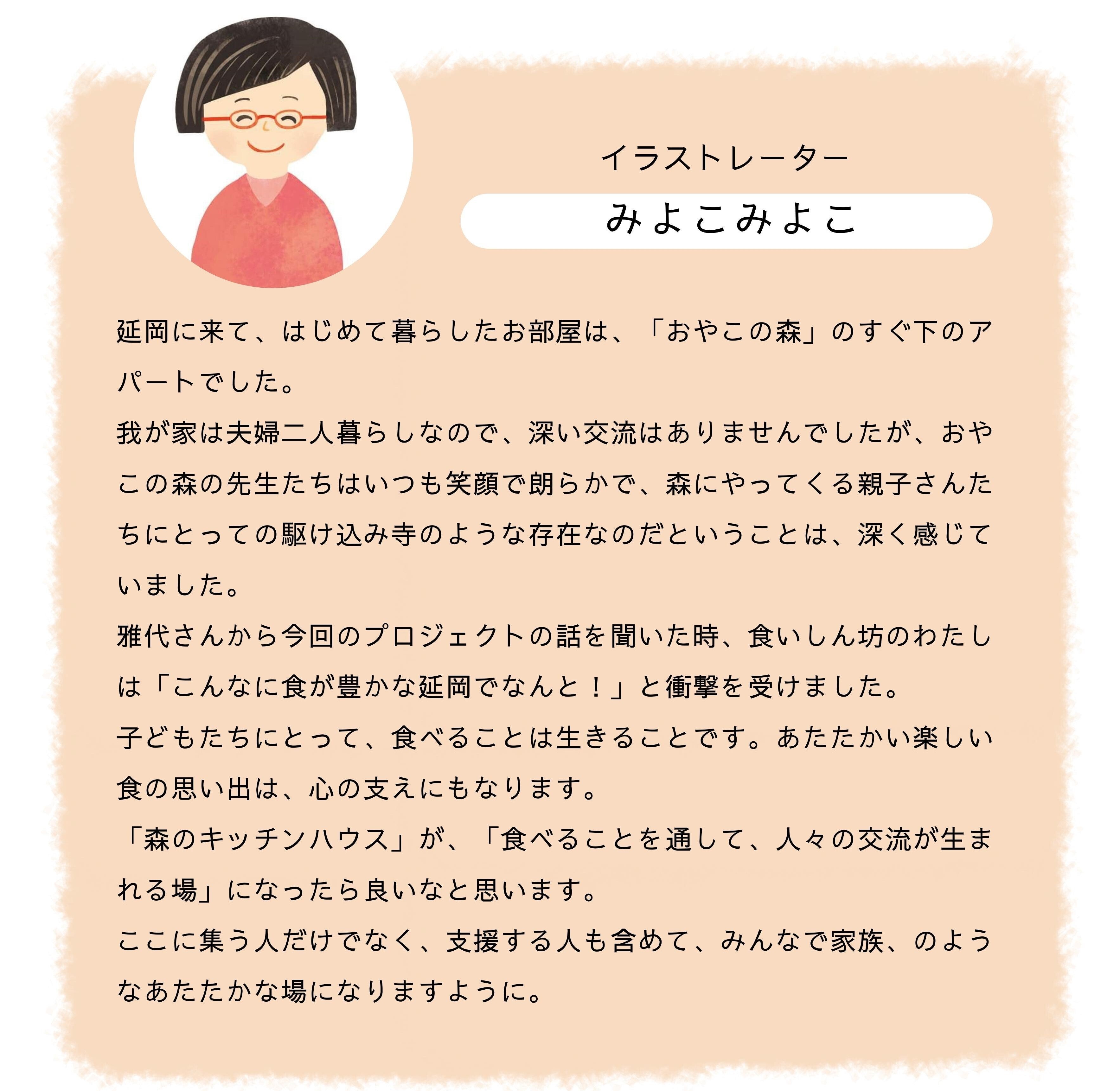 またリターンは、イラストレーターみよこみよこさんのご厚意で「森のキッチンハウス」為のに描き下ろしていただいたイラスト入りのお礼のポストカードや、おやこの森で「バイオリン先生」の愛称で親しまれている髙山由布さん達による「森の演奏会」へのご招待など、私たちや子ども達から感謝いっぱいの気持ちをお送りさせていただきます。