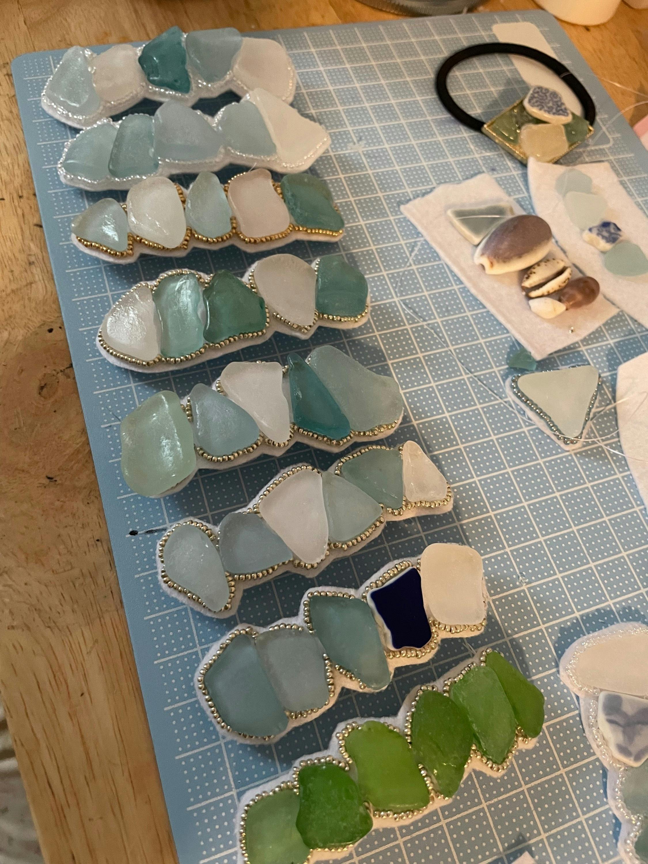 シーグラスバレッタをお渡しします。一つ一つシーグラスを選定してビーズ刺繍を施してあり、シーグラスの形や配色で世界に一つだけのバレッタとなっております。