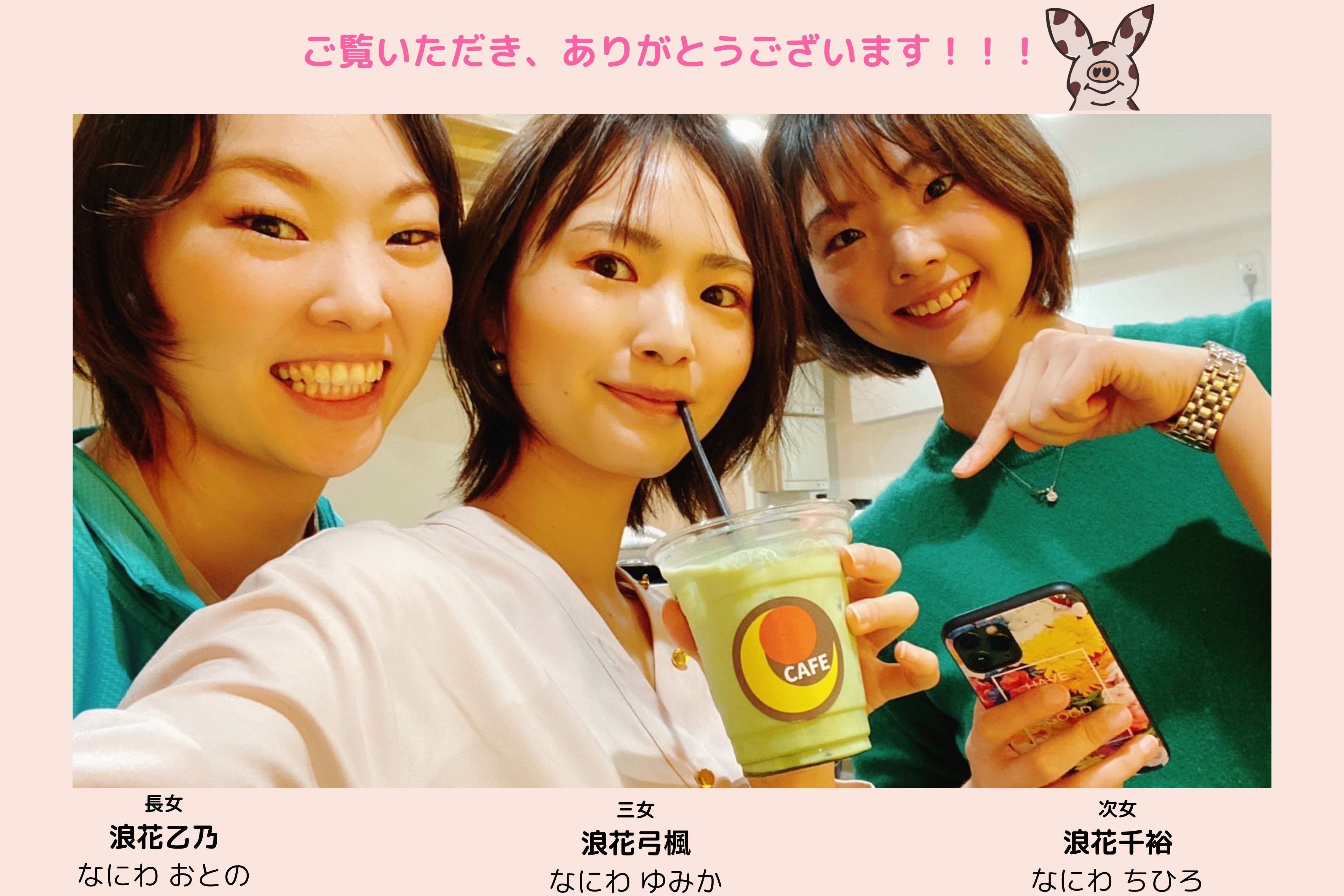浪花乙乃(長女/写真左)・千裕(次女/写真右)・弓楓(三女/写真中央)と申します!この度、私たちが営むカフェ「EーCAFE」でオリジナルキャラクターを使ったグッズを作るため、皆様にご支援いただきたく、クラウドファンディングに挑戦させていただきます。