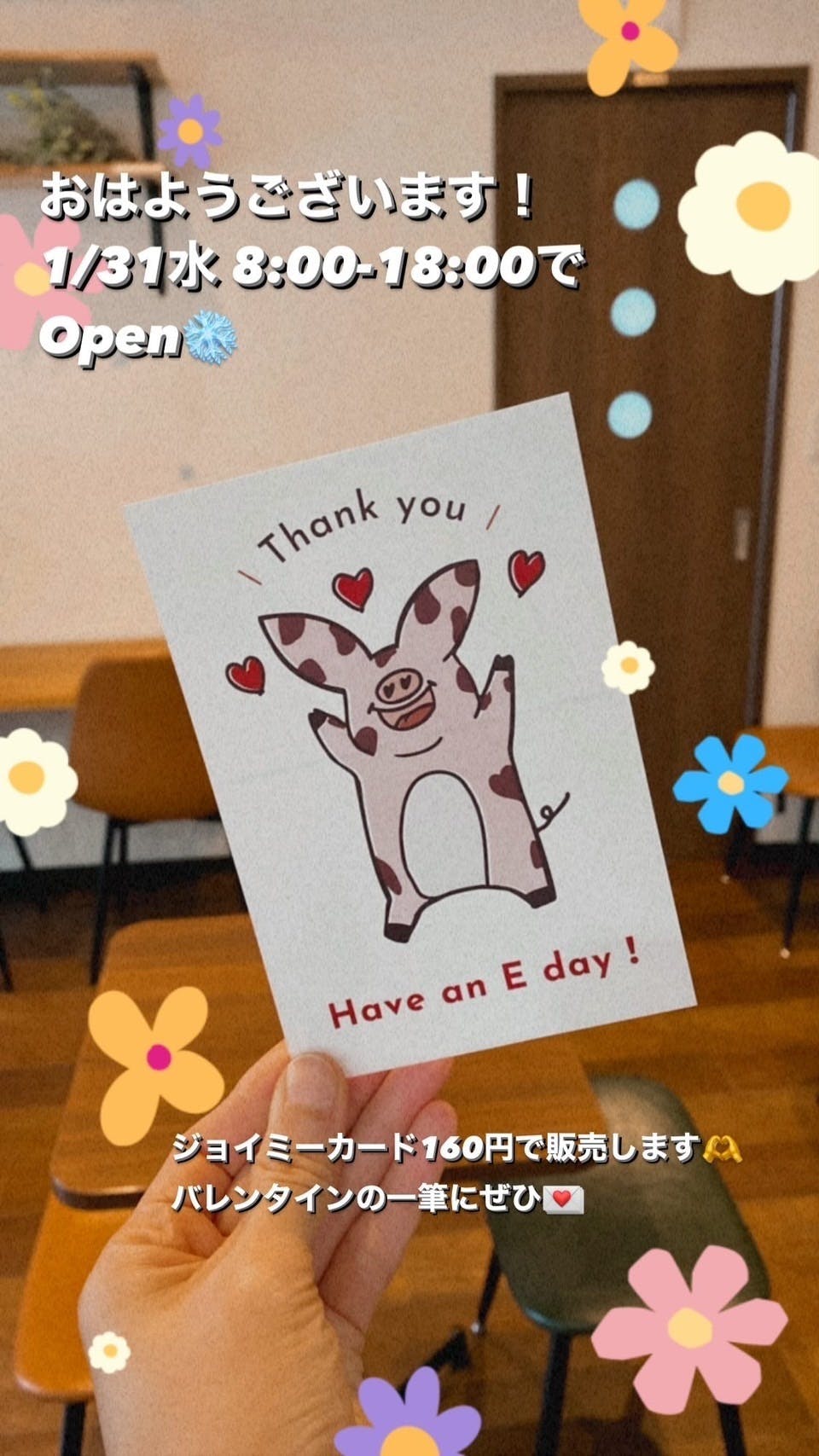 2024/01/31 15:00こんにちは!板橋区役所前のE-CAFEなにわ三姉妹です★お蔭様でグッズ制作も徐々に進んできております。いくつかリターン送付いたしましたのでご報告となります。◇応援プラン:キャンプファイヤー上のメッセージでお礼のメッセージを送付させていただきました。本当にありがとうございます!◆超応援プラン:ジョイミーちゃんのポストカードを郵送させていただきました。万が一まだ届いていらっしゃらない方はお手数ですが、ご一報いただけますと幸いでございます。◇フード&ドリンクチケット:メールにてチケットをお送りしております。届いていらっしゃらない場合は迷惑メールBOXもご確認お願いいたします。万が一まだ届いていらっしゃらない方はお手数ですが、ご一報いただけますと幸いでございます。 また、画像のポストカード160円にて店頭にて販売を開始いたしました。バレンタインやお誕生日、記念日などのギフトと共に感謝の一筆を添えるのに最適です。ぜひご覧ください♪その他のグッズ制作もお楽しみに!それでは1月も今日で終了ですが2月もE(イイ)日々になりますように★+*E-CAFE浪花三姉妹より もっと見る