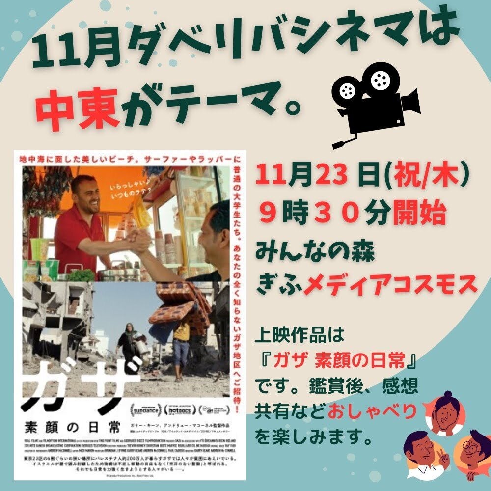 「映画でつながれば、人生はもっと豊かになる。」を合言葉に、月1回、公共施設を借りて社会課題などを扱ったドキュメンタリー映画を上映し、その後リラックスした雰囲気で議論ではなくとりとめもないおしゃべりを愉しむ、カフェのような場所をつくるというイベントを継続的に行ってきました。