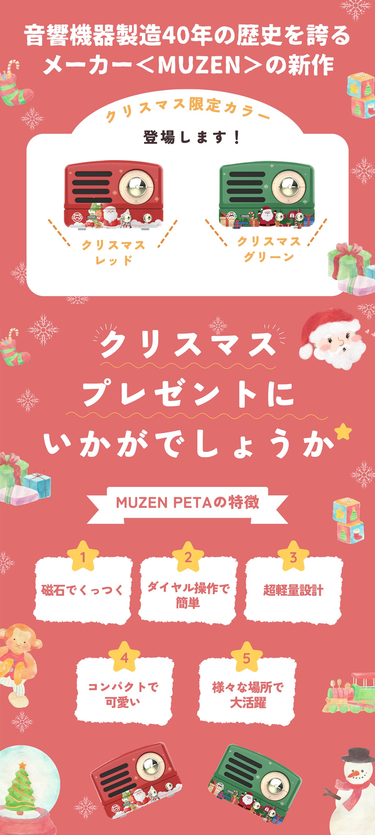 前回のプロジェクトで、MUZEN「PETA」が応援金額89万円以上を達成しました。今回はクリスマス限定カラーのMUZEN PETAスピーカーを紹介し、さらに皆様からのご支援をお願いします。