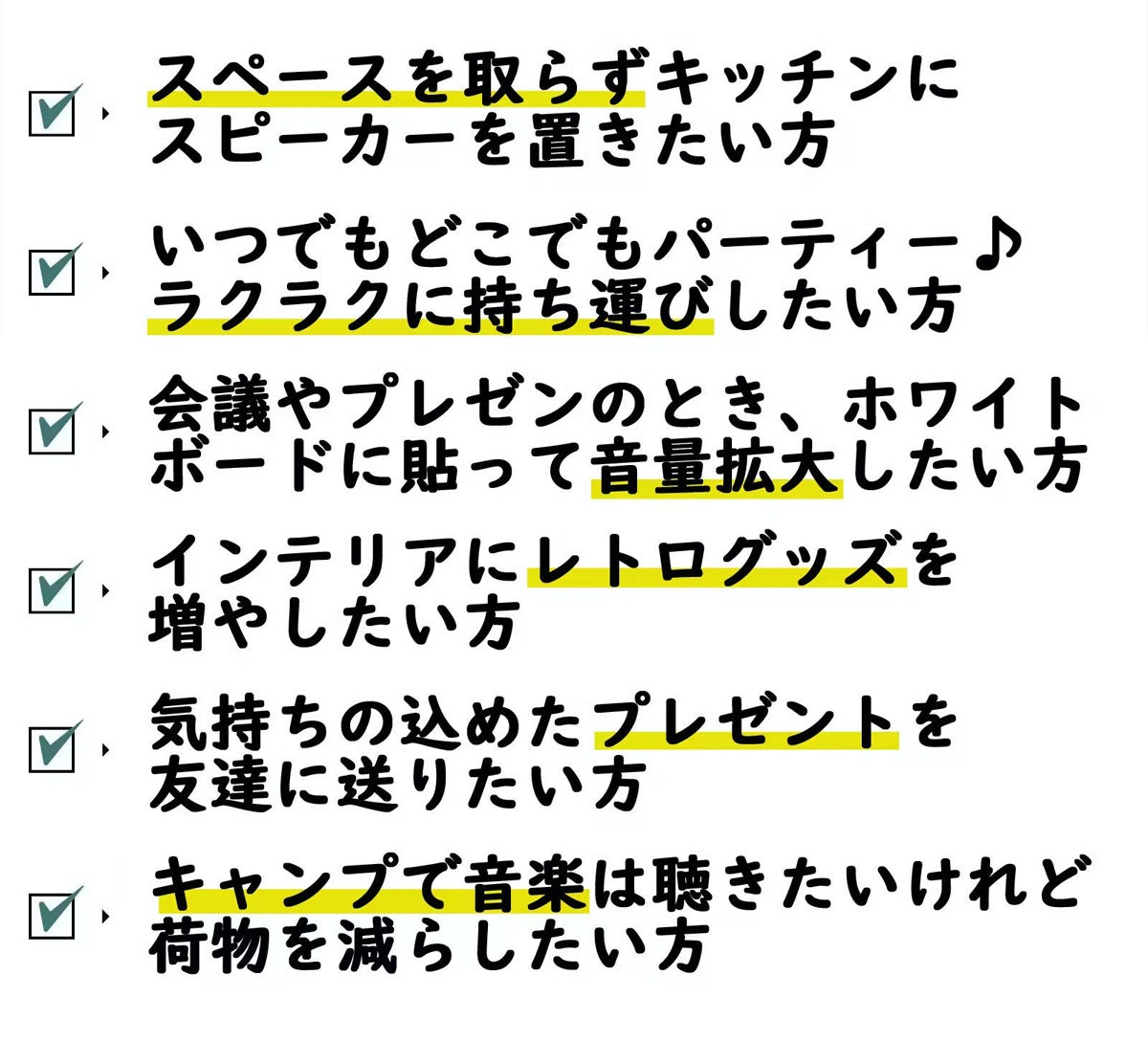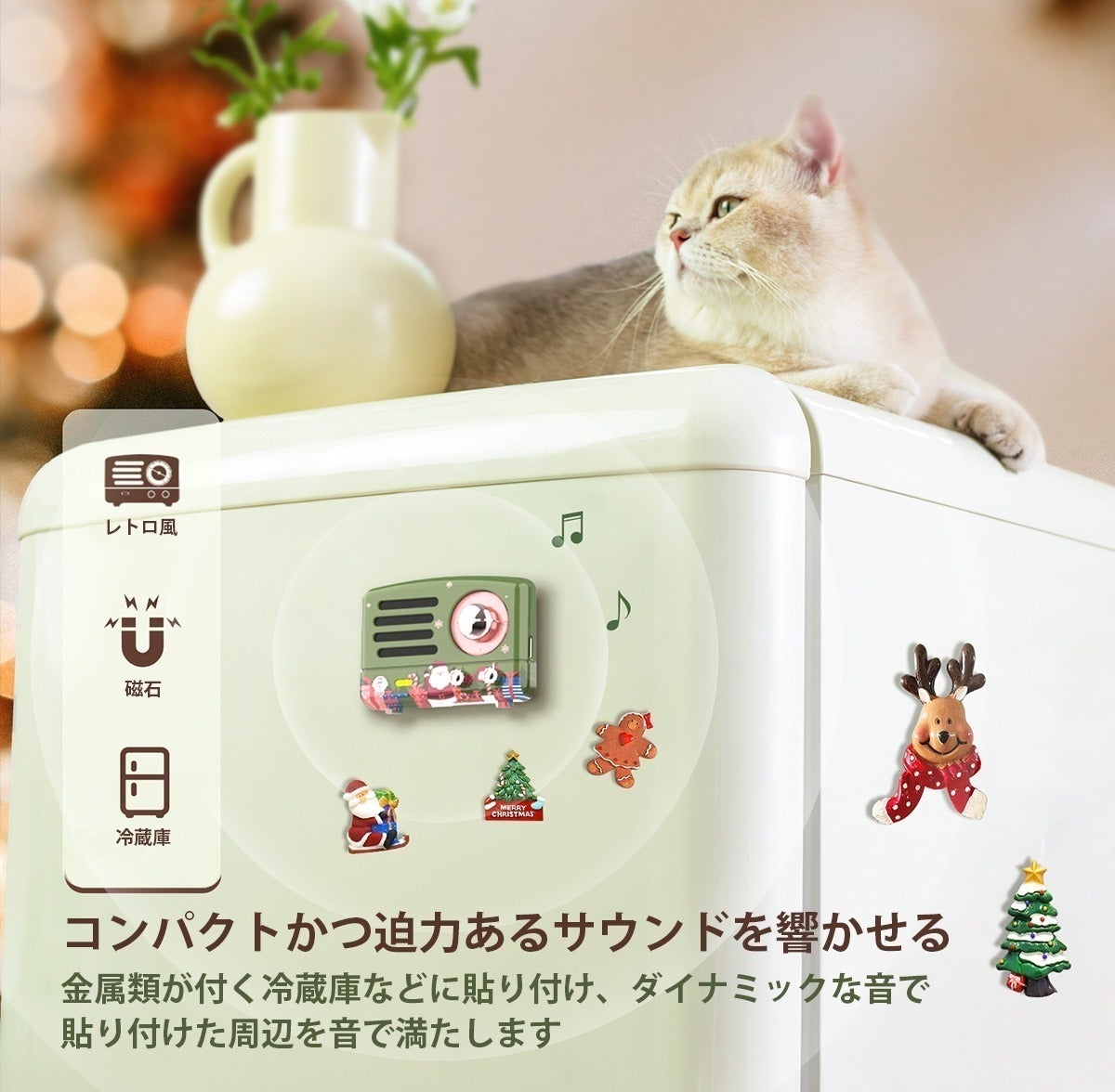 冷蔵庫などの⾦属に貼ること出来る置き場に困らない。操作もダイヤルを回すだけの簡単操作、ながら作業が楽しくなるBluetoothスピーカー。