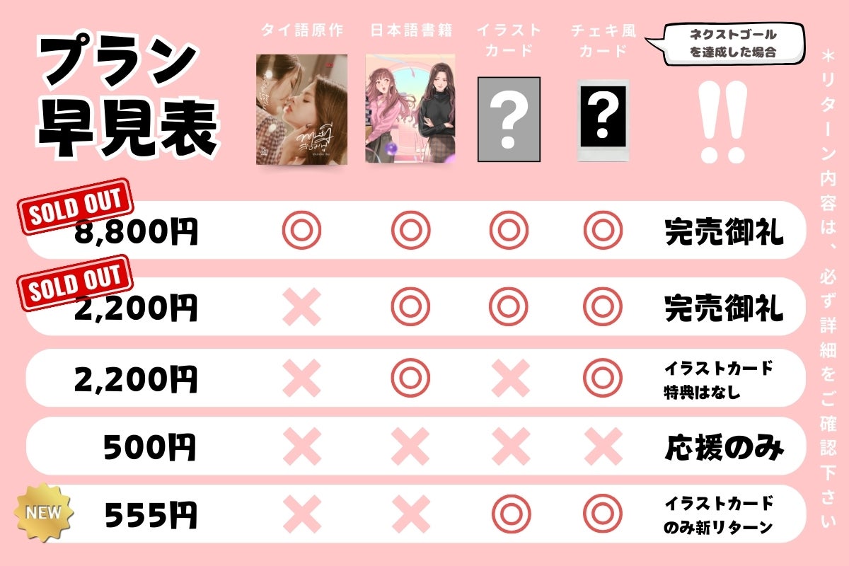 *タイGL.comおよび、CAMPFIREの活動報告にて、適宜進捗をお知らせしてまいります。ご支援いただく人数によっては、やむを得ずスケジュール等を変更する場合がございます。また、リターン配送完了後、オンラインショップ他でも特典を付ける等して販売を予定しております。予めご了承ください。