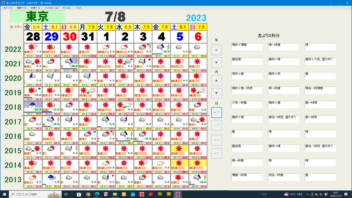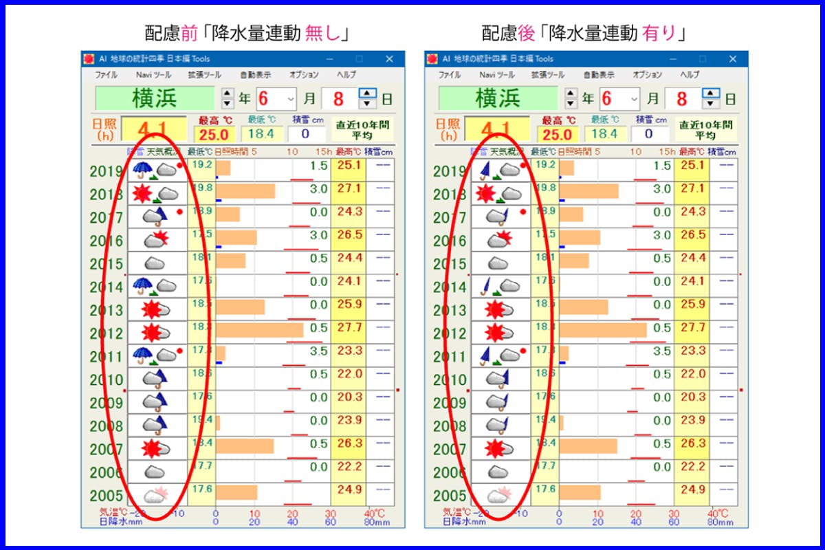この「晴れナビ」は、現在では、「快晴ナビ」「雨ナビ」「雷ナビ」「大雨ナビ」「暴風雨ナビ」「気温ナビ」「降雪ナビ」「積雪ナビ」「大風ナビ」「大雪ナビ」「ふぶきナビ」「みぞれナビ」「あられナビ」「ひょうナビ」「霧雨ナビ」「霧ナビ」「最大1時間降水量ナビ」等、全19種類のナビツールに発展し、全国各地の気候風土の把握や比較に活躍しています。これらのナビは、10年間の平均の統計値だけでなく、毎年の各年データを見ることが出来るようにも作り込んでいますので、「気象地域史」「気象データ集」「災害備忘録」としても使えます。お茶の間に1本備えておくと、大変役立ちます。