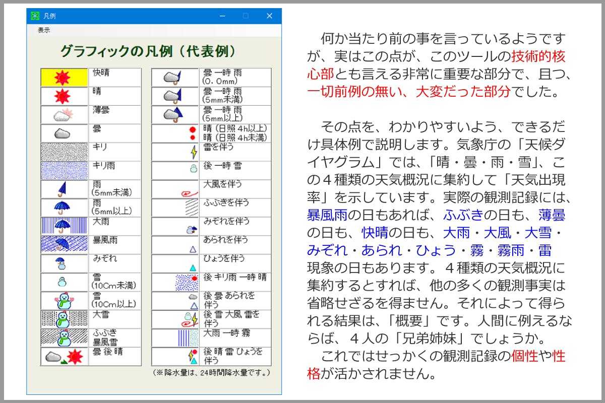 しかし、どうしたら「一目パッと見で全体像が把握出来るのか?」、「どうやって実現するのか?」と考えた時には、それこそ「映画のような魔法が必要…」と思える難題でした。似たようなアドバイスを、北海道大学の教授からもいただいていました。「過去天気を並べて表示する魅力」に加え、「他にも何らかの魅力を追加しては?」というアドバイスでした。