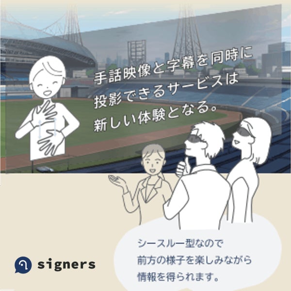 1. 「補聴グラス」の開発 シースルー型のARグラス上に遠隔手話通訳の映像もしくは字幕をリアルタイムで投影する、新形態の補聴デバイスです。一般的な補聴器を使用した場合、とりわけ感音性難聴を患っている方については、クラクションやサイレンなどを聞き取ることはできますが、会話を正確に聞き取るのは難しいのが現状です。そのためサイナーズでは、「『音』は補聴器で、『声』は補聴グラスで聴こう」をコンセプトとし、補聴器とARグラスを組み合わせて活用することで、より正確に、よりわかりやすく情報を得ることができる世界を目指しています。まずは汎用機と連動するアプリケーションを開発し、最終的にはデバイス単体で利用が可能な「補聴グラス」の提供を目指します。また、将来、補聴グラスが福祉機器の認定を受けることで、聴覚障害者ができるだけ金銭的な負担をせずに入手し、日常的に使えるようになればと考えています。
