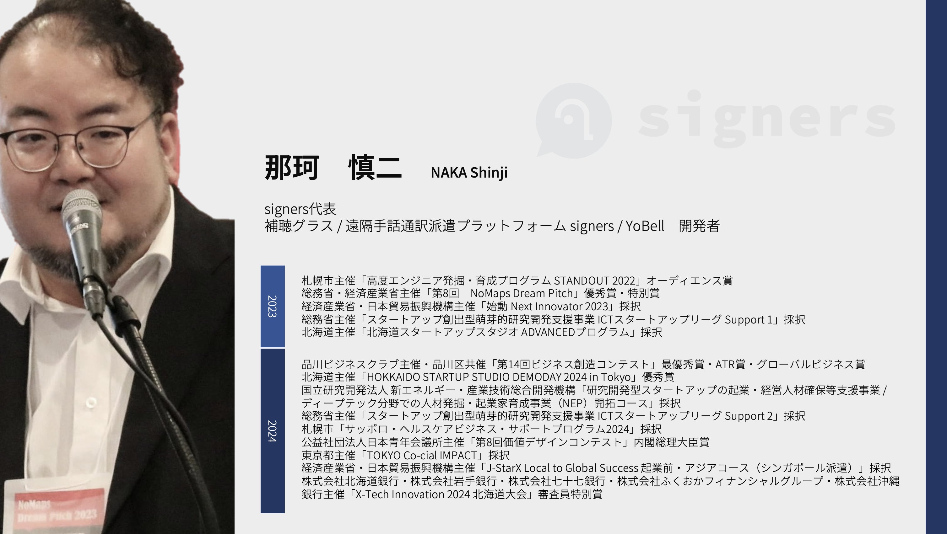 このたびプロジェクトを起案・企画いたしました、北海道小樽市在住の那珂(なか)と申します。わたしは聴者で、妻は聾者です。現在、聴覚障害当事者向けサービスを提供するために「signers(サイナーズ)」という会社の起業準備を進めています。聾者/難聴者・ご家族・手話通訳者・聾学校(聴覚支援学校)など、あらゆる方々が必要とするサービスの提供を目指しています。
