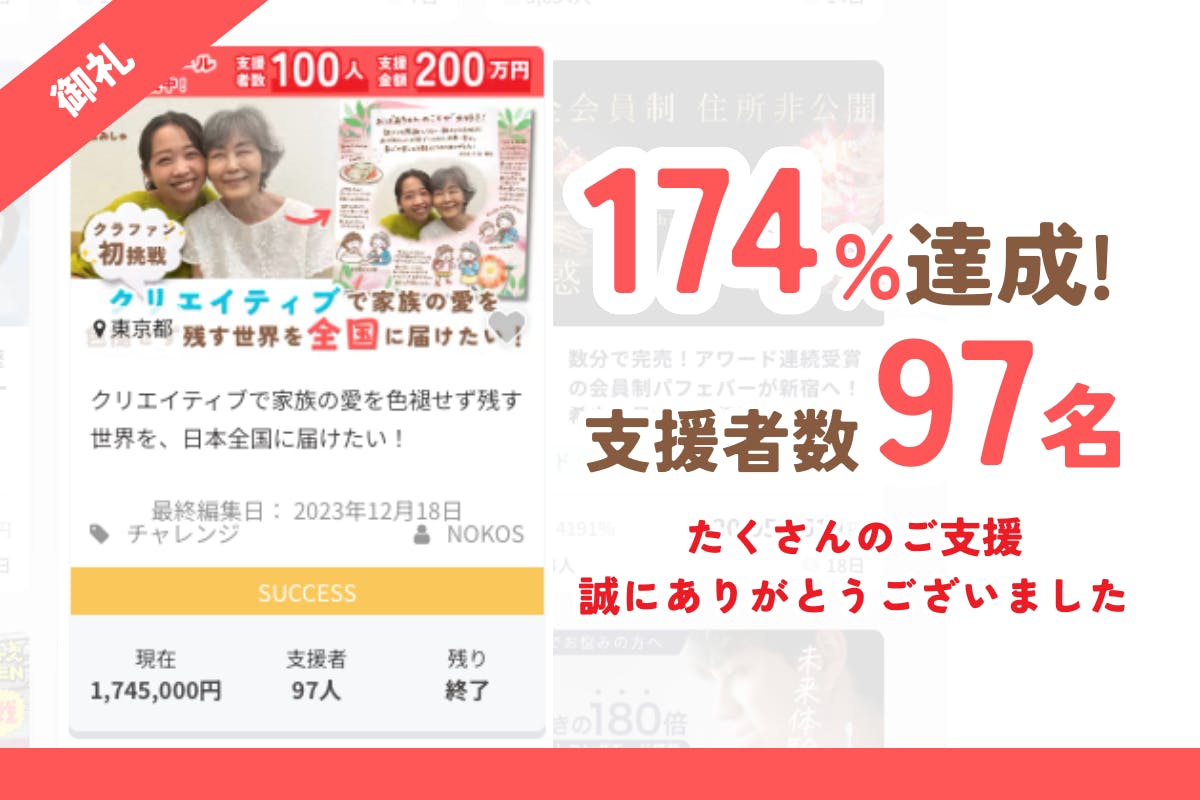 2023/12/31 15:382023年12月30日(土)をもって、クラウドファンディングが終了いたしました。目標金額100万円に対して、97名からご支援をいただき、1,745,000円ものご支援をいただきました。ご支援いただいた方、直接応援のお声がけを頂いた方、皆様に感謝の気持ちでいっぱいです。本当にありがとうございます。11月に会社を設立し、このクラファンで幸先のいいスタートを切りたい、という強い思いのもと、会社としての"宣言"をこのページに詰め込みました。ページを読んで、私たちの活動や思いに少しでも共感していただけた方が、約100名もいらっしゃったことに大変ありがたく思うと共に、今後、1000名、1万人、100万人、とその規模を広げていく所存です。私たちのサービスを通じて、家族に愛情を伝えることができる人、感謝を言葉にできる人を増やしていきます。応援いただいた期待にしっかりと応えられるよう日々事業に真摯に向き合って参りますので、今後ともどうぞ長期的にサポートをいただけましたら大変嬉しく思います。改めて、この度はご支援誠にありがとうございました。株式会社NOKOS代表取締役 樽本理子 もっと見る