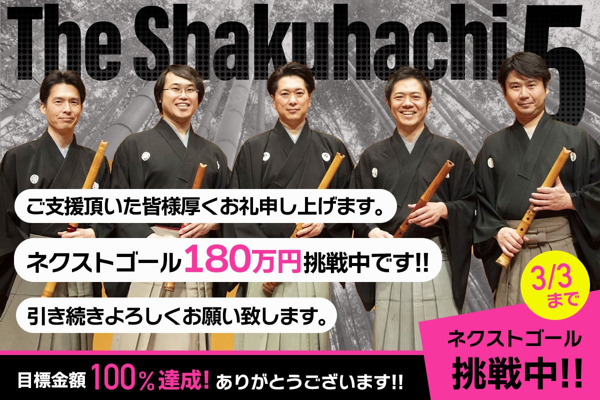 本クラウドファンディングは大変ありがたいことに皆様からの多大なるお力添えを賜り、2月6日をもちまして目標金額に到達しました!お陰様で私たちの向かう大きな目標の一つ、これまでの「The Shakuhachi 5」の活動の"証(あかし)"である、ファーストアルバムの制作がこの上ない形で実現いたします。我々にとってとても大きく高い目標を、まさかこれほど早く達成できましたこと、ご支援いただきました皆様のおかげです。心から厚く感謝御礼申し上げます。