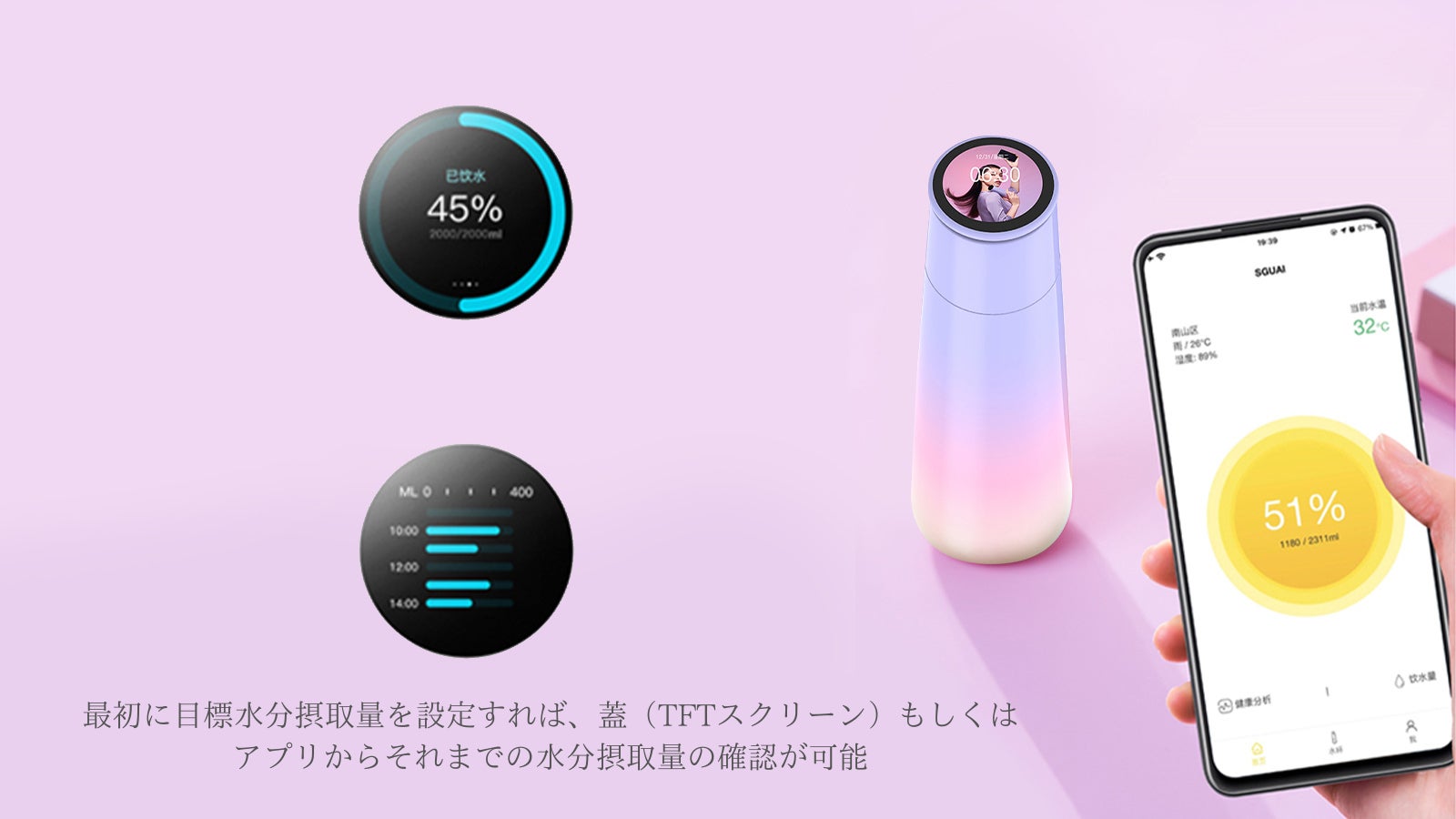 A. 商品が届きましたら「SGUAI」というアプリをインストールしてスマートボトルと接続を行って下さい。仕様については以下御確認下さい。