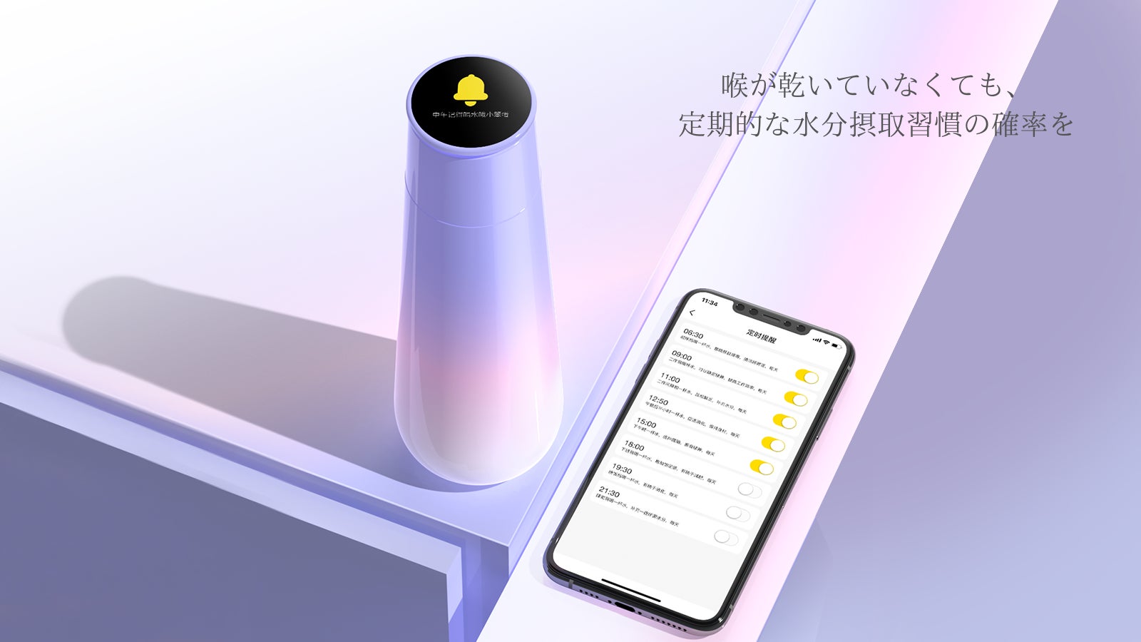 水分補給リマインダー機能によって定期的な水分補給が可能となります。リマインダーのタイミングは専用アプリ経由で詳細な設定が行なえます。
