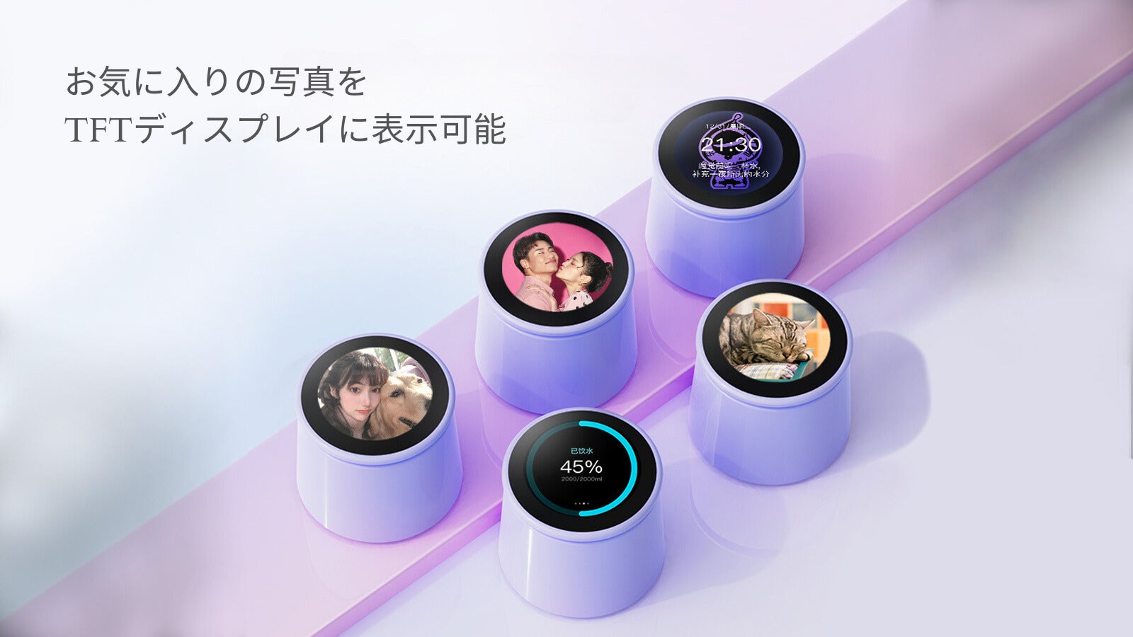 M2スマートボトルの蓋上部には1.3インチのTFTタッチスクリーンを採用しています。 ここから各種機能結果の確認やお気に入りの写真の表示を行います。TFTタッチスクリーンを直接タップして操作することも可能です。