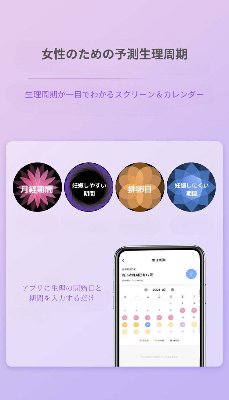 アプリに生理の開始日や期間を入力するだけで、カレンダー&TFTタッチスクリーン経由で予測生理周期がひと目でわかります。