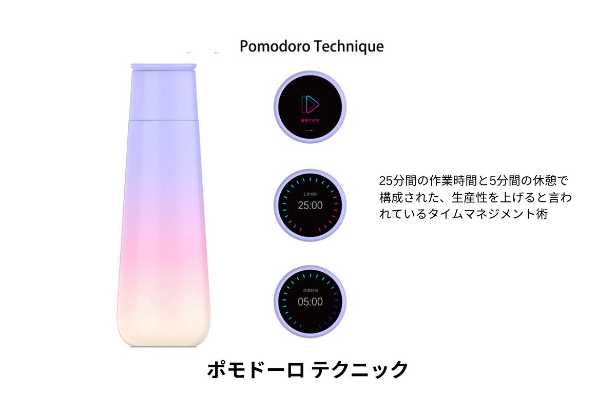 M2スマートボトルはポモドーロテクニック機能を搭載しています。仕事や勉強で集中したい時は常に手元において、5分間の休憩時に水分を補給してください。