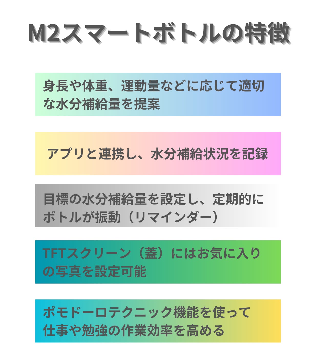 M2スマートボトルは単なるボトルではなく、ペットボトルでは決して実現できないパーソナルケア アシスタントツールといえます。