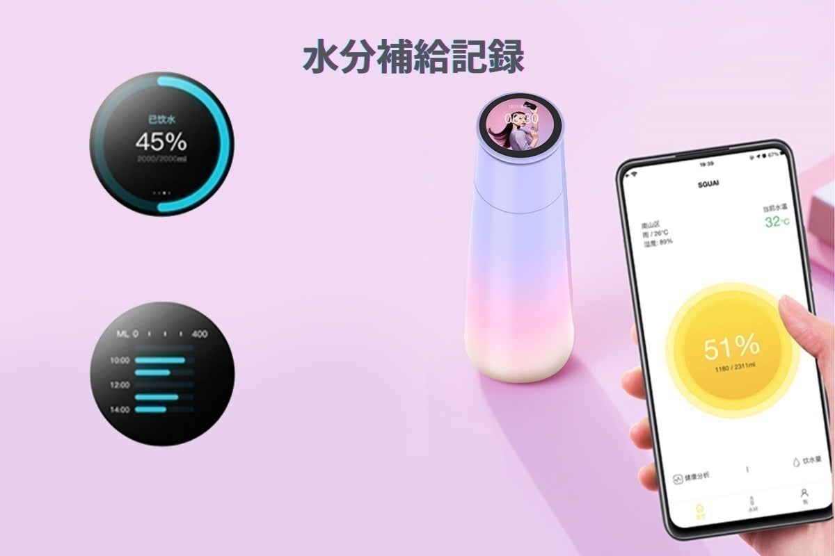 ・非常に充実した機能を備えているので、M2スマートボトルを購入しました。まず第一に、蓋の部分(TFTタッチスクリーン)に自分の好きな写真を映すことができ、私はそれが気に入っています。スマートフォンで写真を撮ると、M2スマートボトルに直接同期できます。第二に、断熱効果が非常に優れていると思います。スマートフォンと連動させることで、目覚まし時計だったり生理周期などのさまざまな機能を活用できます。非常に便利で、買う価値があります。