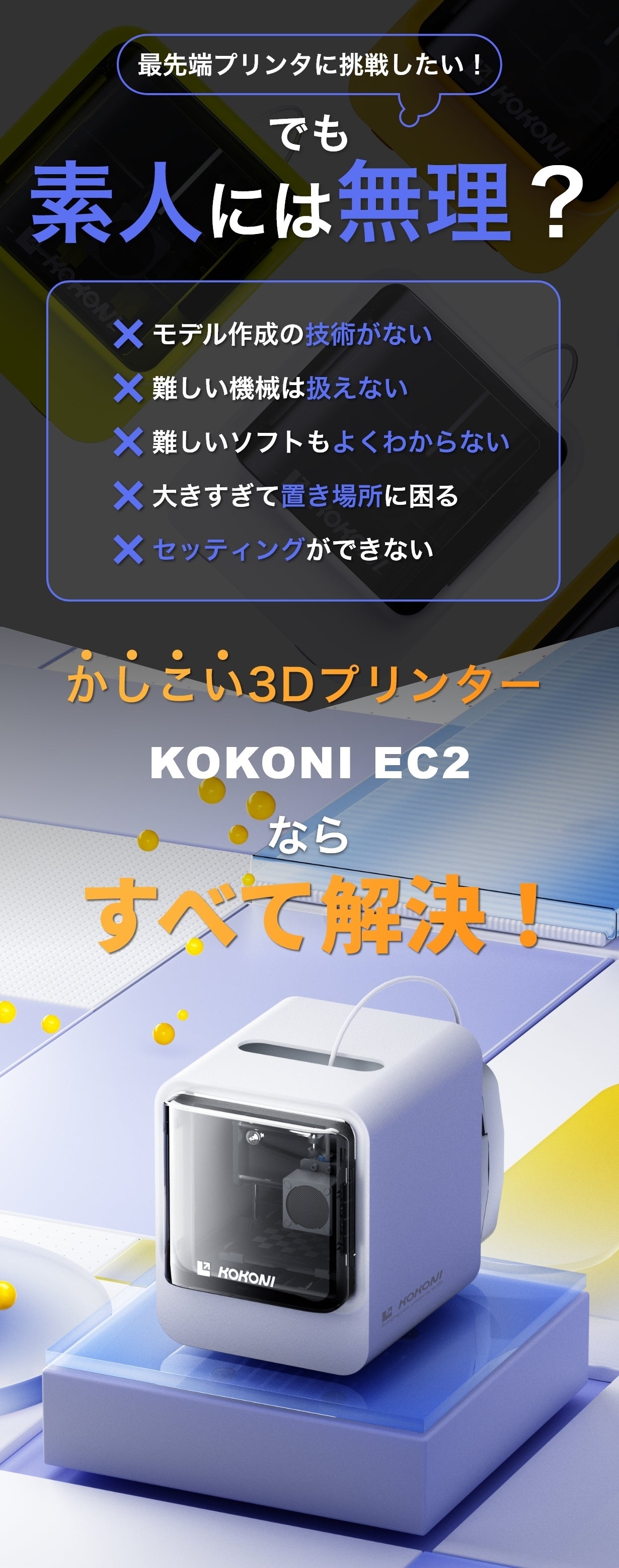 KOKONI EC2は、使いやすさを最優先に設計されています。複雑な設定や煩雑な機器の組み立てといったステップは排除され、初心者の方でも気軽に使用できるようになっています。単にスイッチをオンにするだけで、直ちにプリントの楽しみを体験することができるのです。