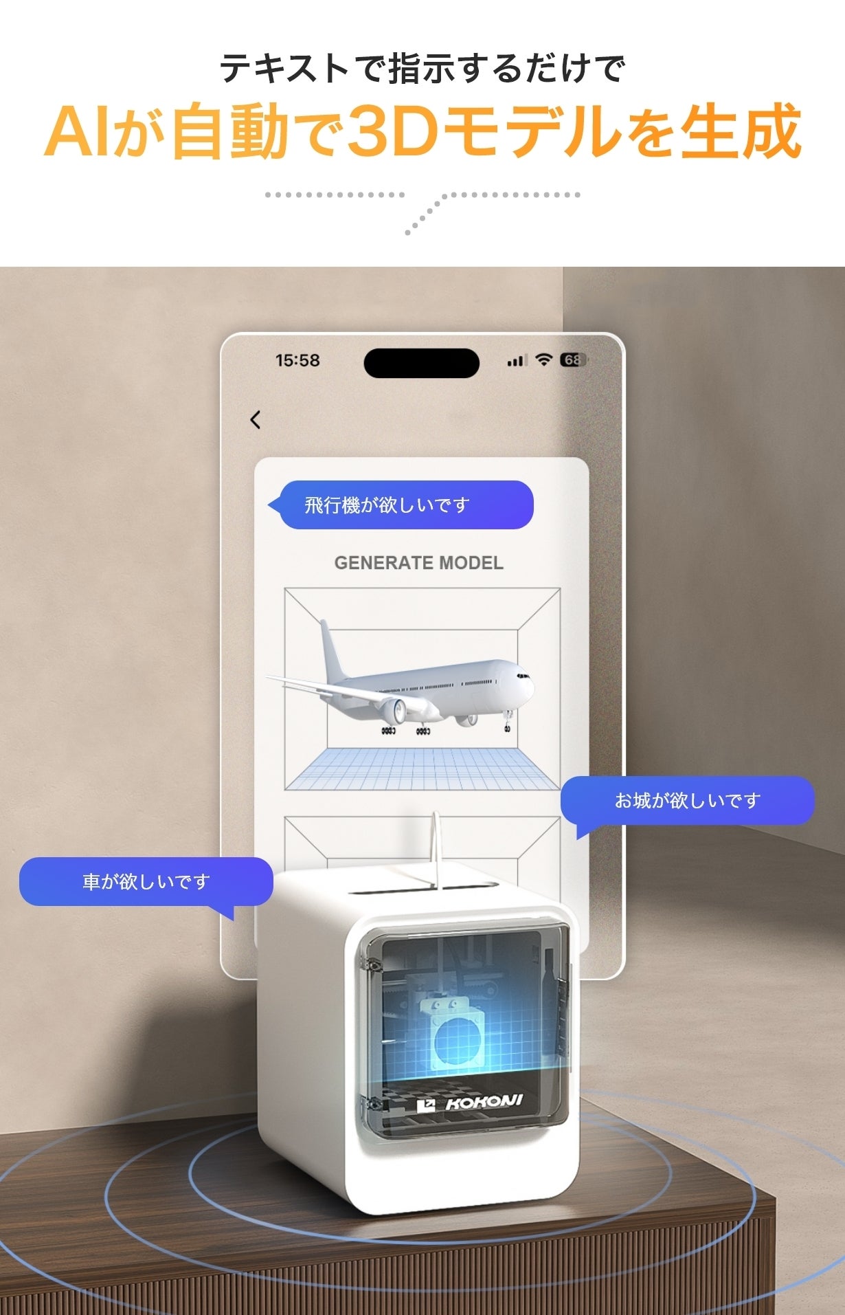 3Dモデリングの専門知識やスキルがないと感じるかもしれませんが、それに頼る必要はありません。最先端のAI技術が、あなたのアイディアやビジョンをしっかりとサポートしてくれます。このプリンターを使えば、心の中で描いていたデザインやイメージを手間なく具体化できます。経験者でなくても、このテクノロジーを利用して、独自のオリジナル作品を瞬時に生み出すことができるのです。