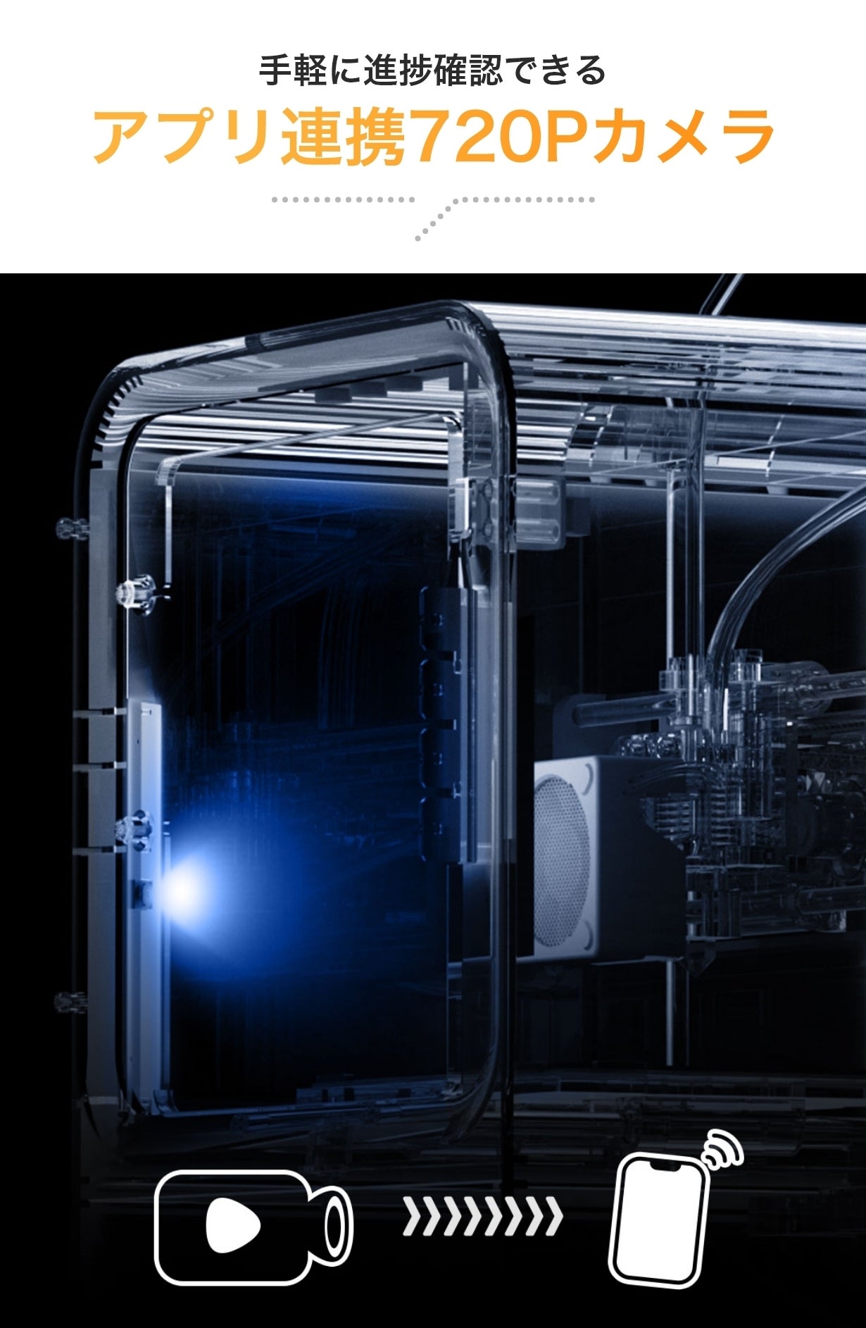 KOKONI EC2は、720Pの高画質カメラを搭載しており、その映像は簡単に専用アプリで確認することができます。このカメラ機能を使用すれば、ユーザーはプリントの進行状況をリモートでリアルタイムにチェックすることができ、外出先からでも安心してプリントの進捗を監視することが可能となります。
