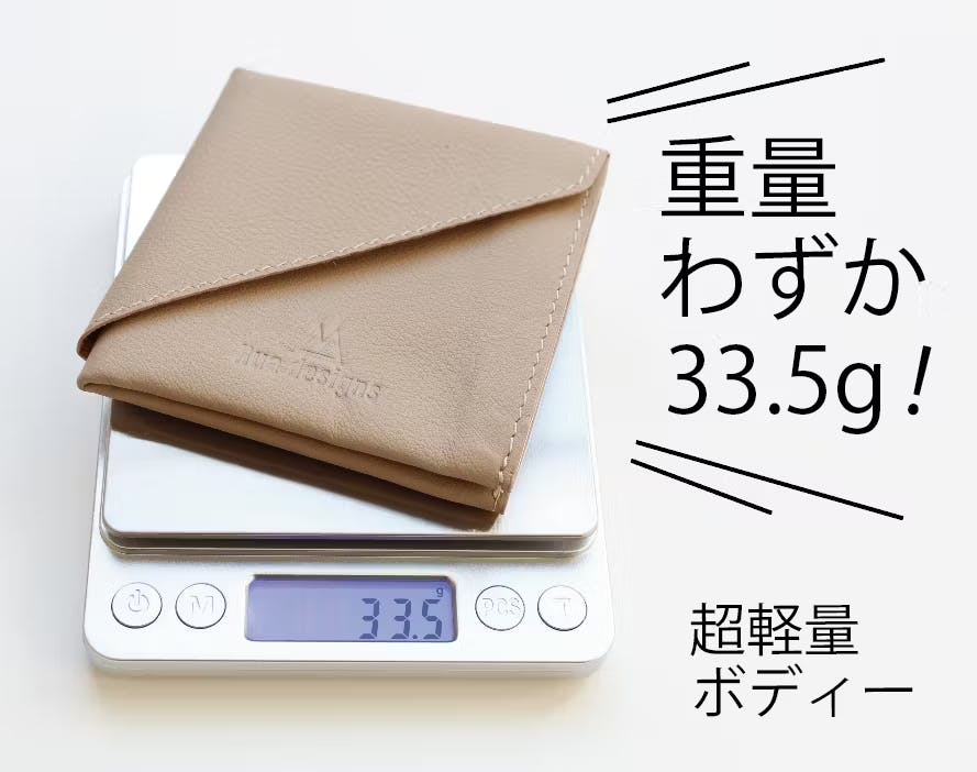 財布として使用できる極限まで革厚を目指した結果、二つ折り財布の最軽量クラスの33.5gを実現しました。もう重たい財布を持ち歩く昨日までの自分にさよならです。