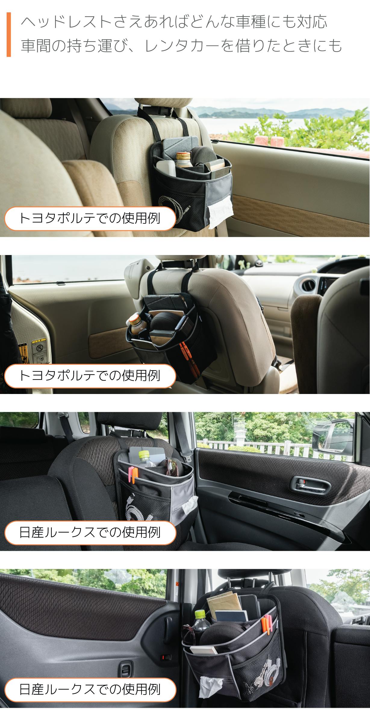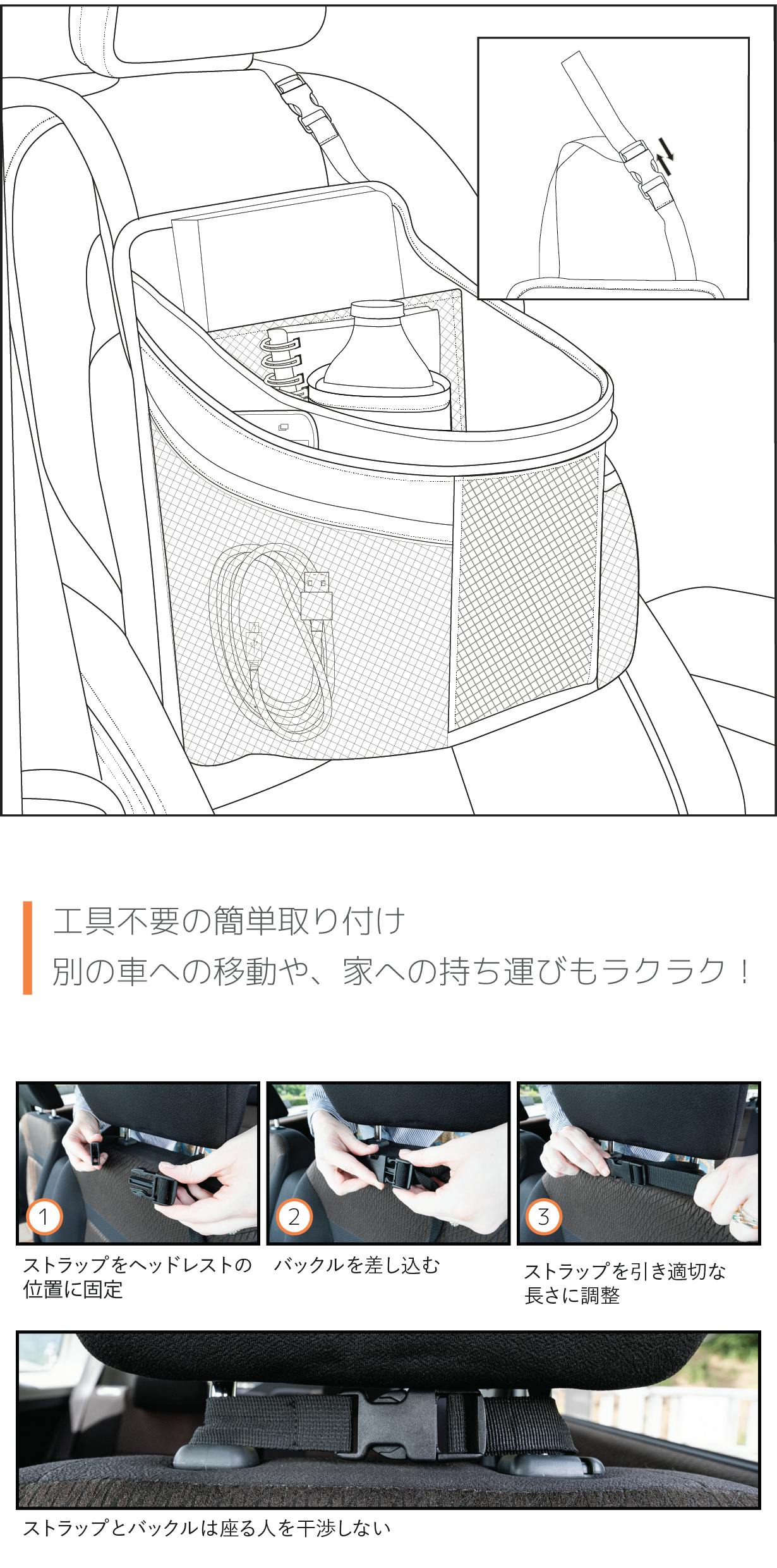 ヘッドレストにつけるだけで、車内には収納スペースが完成!浮