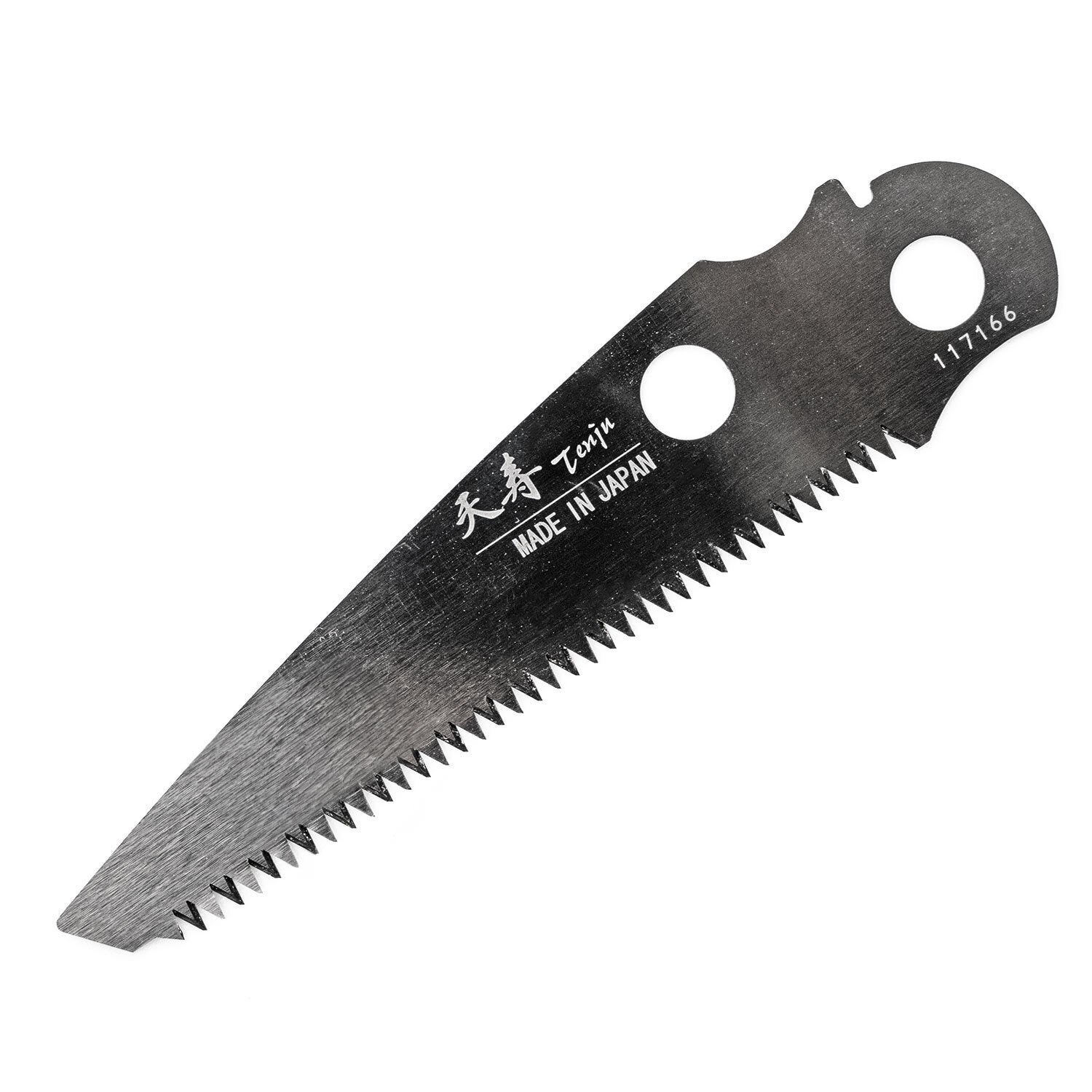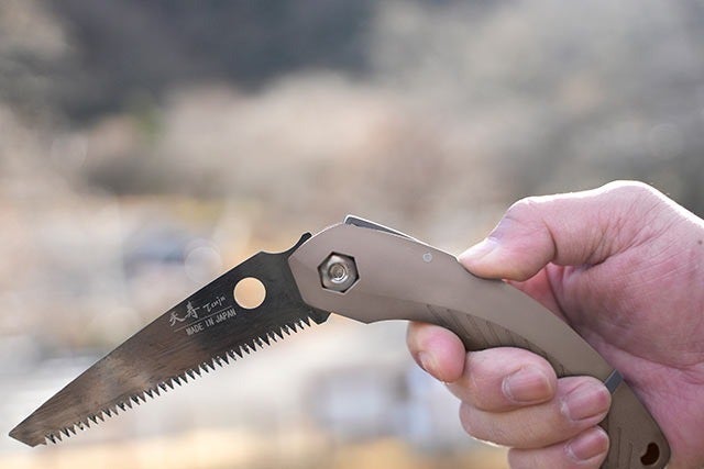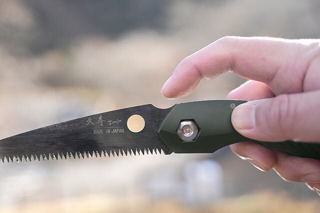 では、このポケットブッシュソーの刃は何なのかというと、「剪定用」の刃付けを施された「天寿」ブランドとコラボした刃を採用しています。