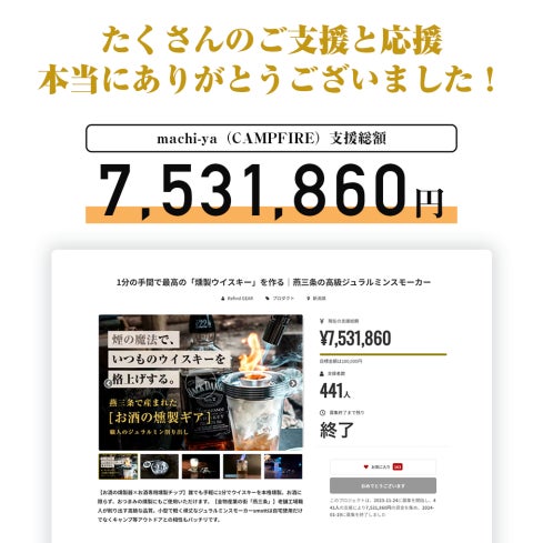 お陰様で、達成率7,531%超えという私共の想像を超える結果を持ちまして、無事にmachi-yaプロジェクトを終了することが出来ました!