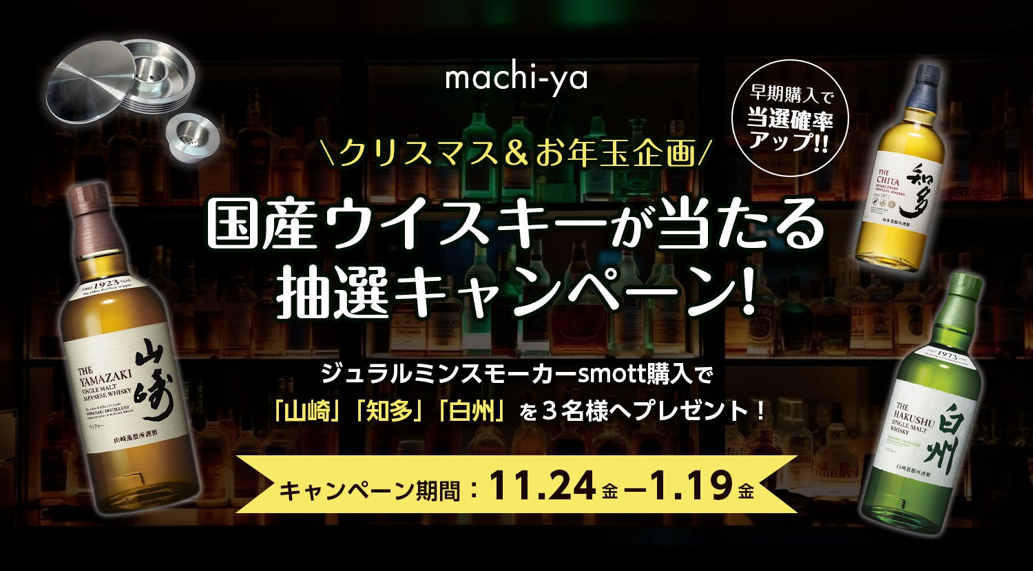 machi-yaにてsmottを購入された20歳以上の方の中から抽選で、国産ウイスキー「山崎」「白州」「知多」が当たるキャンペーンを開始いたしました。近年ではウイスキーブームの影響で入手が難しくなった国産ウイスキーをゲットするチャンスにぜひご参加ください。<<キャンペーン詳細はこちら>>キャンペーン参加方法は対象期間(2023年11月24日~2024年1月19日)にmachi-yaにてsmottを購入するだけで自動的に参加となります。※すでにmachi-ya にてご購入済みの方は自動的にキャンペーンにエントリーされています当選された方には対象期間終了後、machi-ya内のメッセージにてご年齢と受け取りの意思確認をさせていただきます。詳細はキャンペーン特設ページにてご確認ください。 <<キャンペーン詳細はこちら>>※ 当キャンペーンの運営にmachi-ya、CAMPFIREは一切関与しておりません。 Refind GEARが独自に行っているキャンペーンとなっております。 当キャンペーンに関するお問い合わせはRefind GEAR宛にお願いいたします。 info@refindgear.jp