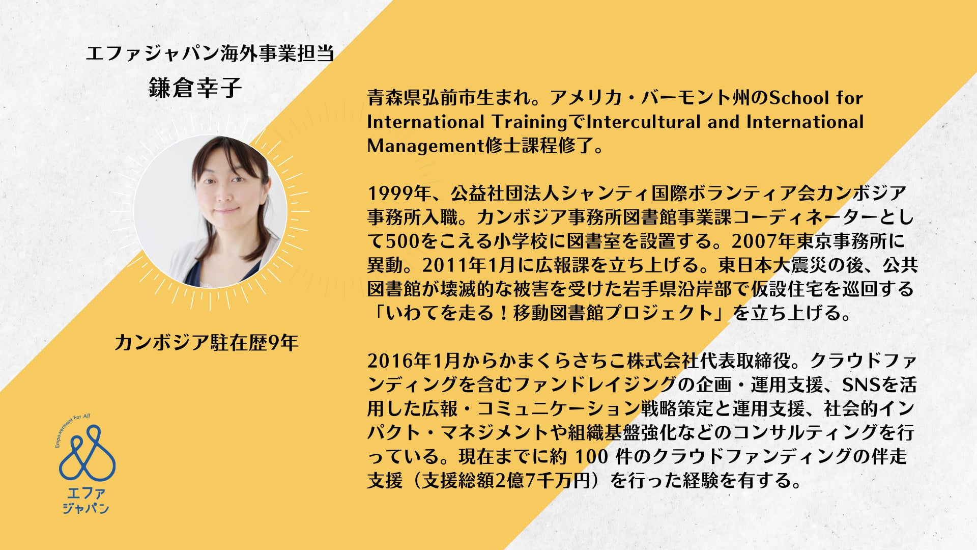 今回もエファ事務局より、鎌倉幸子プログラムマネージャーを紹介します(トップ画像は鎌倉さんのアバターです)。