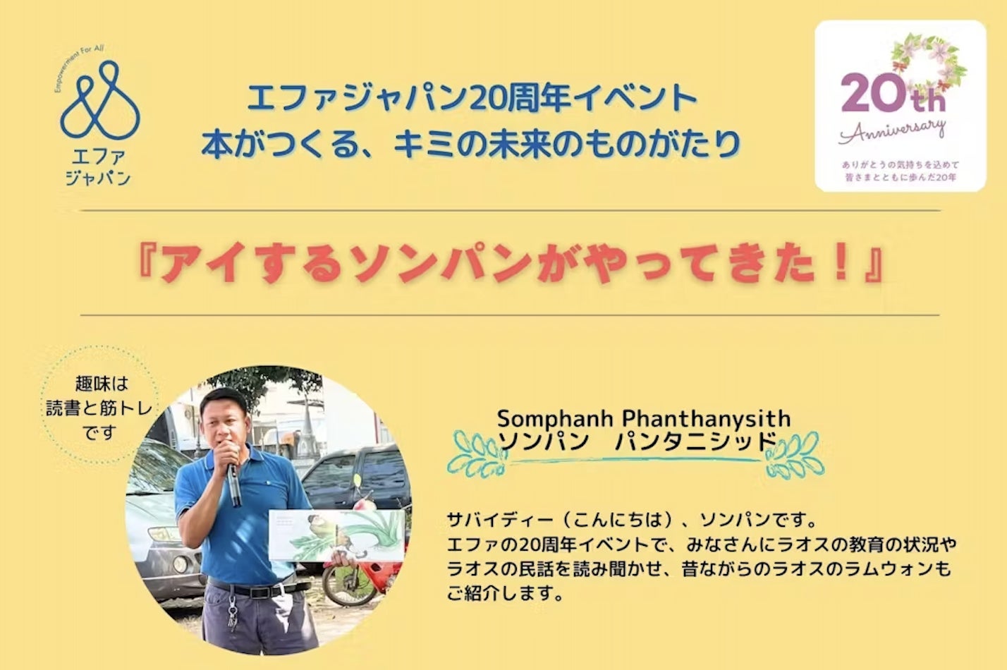 エファは設立20周年。記念として、ラオスの現地スタッフ、ソンパンさんを招聘へいし、活動の現場の様子を紹介するイベント『アイするソンパンがやってきた!』を行います。