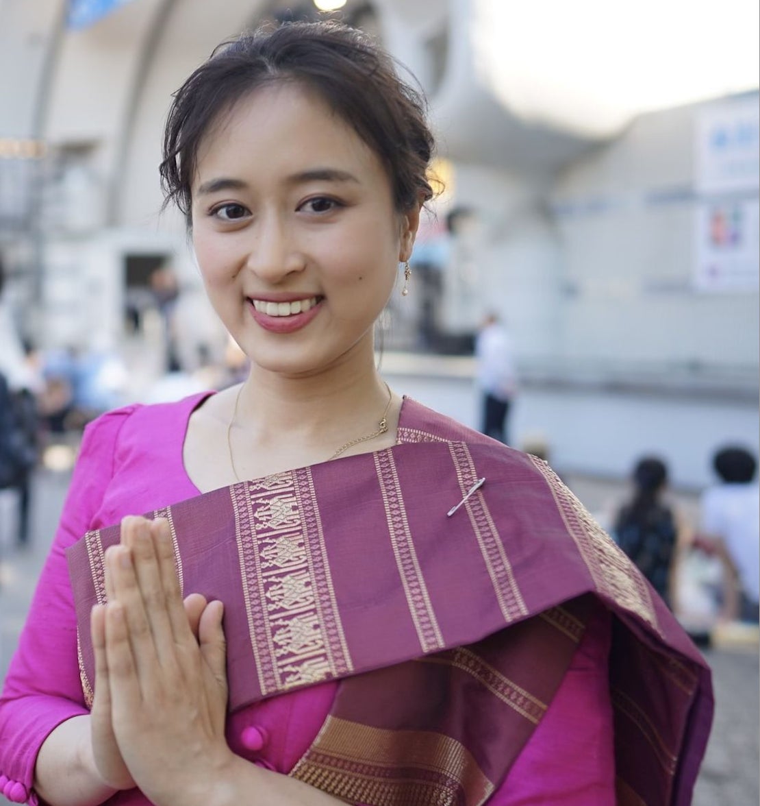 赤い靴を履いているのがミンさん保育園の子どもの日に初めて伝統舞踊に触れました。クラスの代表者として選ばれ、それ以来ずっと踊り続けています。小学校から高校生まで、学校の行事やイベントで多くの機会に出演してきました。そして、来日後も伝統舞踊を通じて交流会やラオスフェスティバルでの披露ができることをとても嬉しく思っています。これからも踊り続けていきたいと思います。どうぞよろしくお願いいたします!