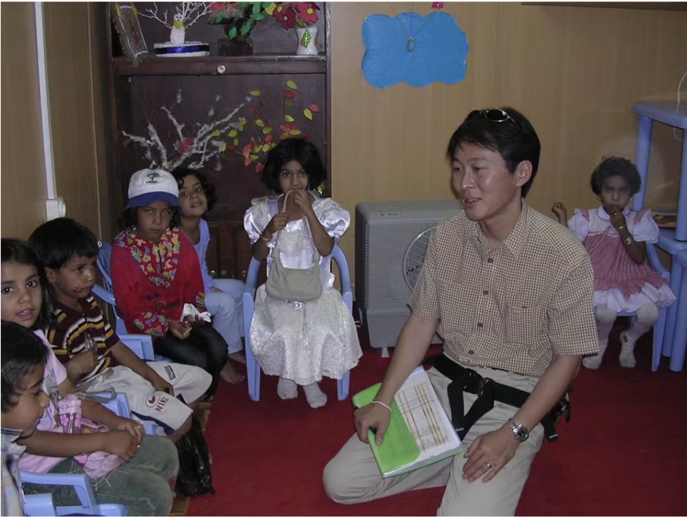 村で初めての図書室にだれよりも早く駆けつけて、声を出しながら一心不乱に絵本を読んでいたそうです。彼は、対人地雷によって右足首を失ってしまい、松葉杖をついている少年でした。