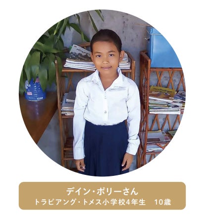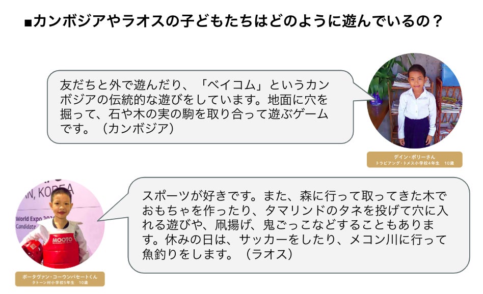 「近所の友だちとサッカーをするのが僕のお気に入りの時間です。たまに友だちとメコン川に行き、魚釣りをします。釣った魚は家の食卓に上ります。」