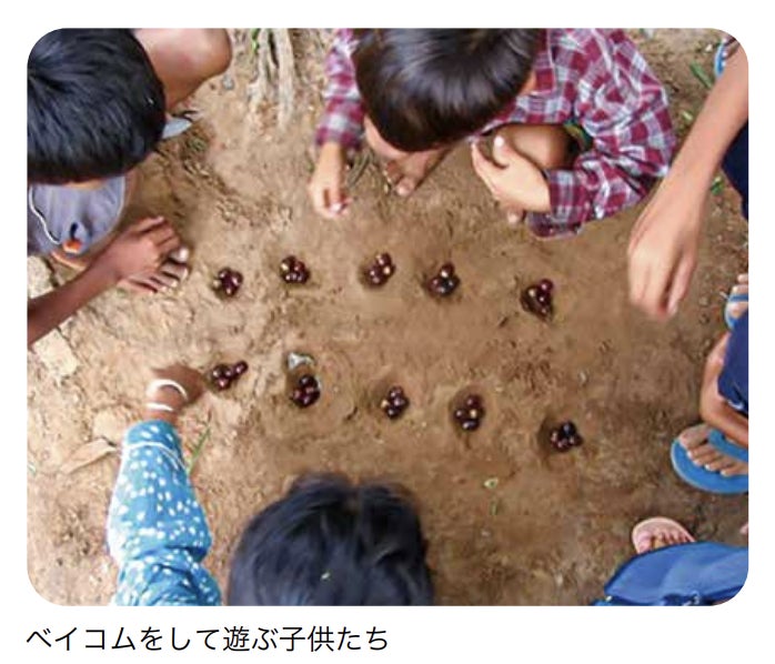 「友だちと外で遊んだり、ベイコムというカンボジアの伝統的な遊びをしています。地面に穴を掘って、石や木の実の駒を取り合って遊ぶゲームです。」
