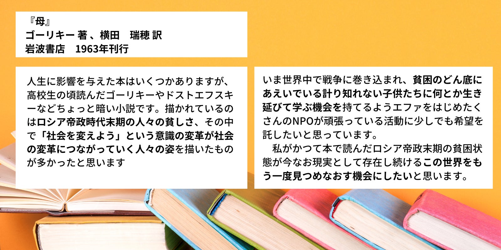 心を強く動かされたり、人生に影響を与えた本はいくつかありますが、高校生の頃読んだゴーリキーやドストエフスキーなどちょっと暗い小説です。描かれているのはロシア帝政時代末期の人々の貧しさ、その中で「社会を変えよう」という意識の変革が社会の変革につながっていく人々の姿を描いたものが多かったと思います(一番印象に残ったのはゴーリキーの「母」という小説です)。