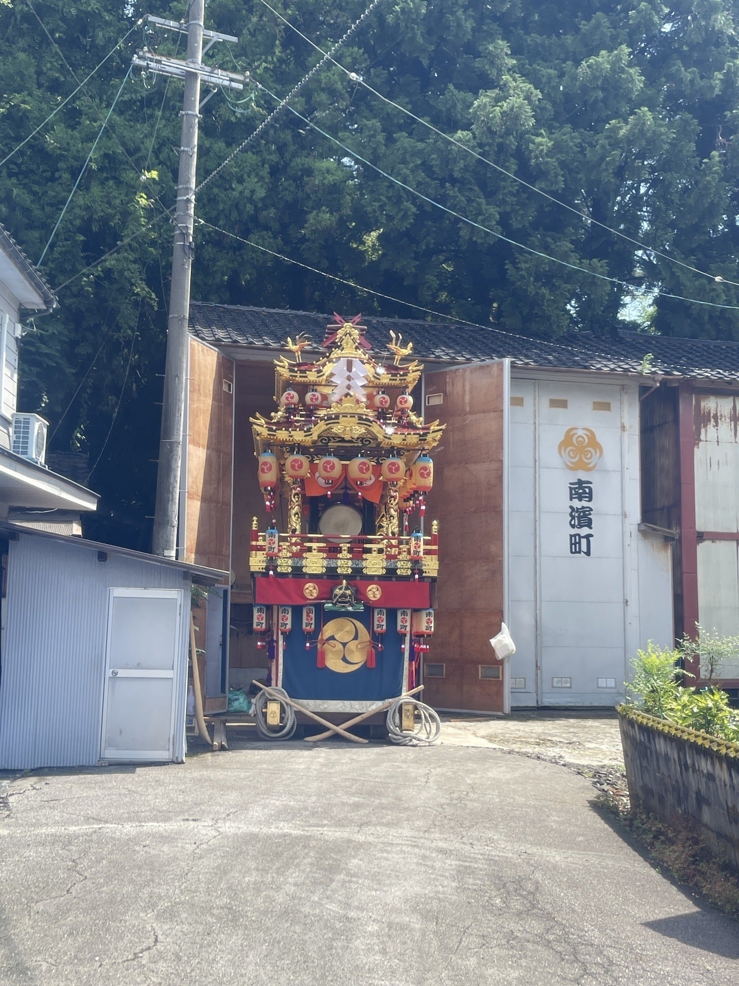 7月20日の珠洲市。道の関係で灯篭祭りの曳山は出さず春日神社の神事のみが行われたが、曳山が倉庫から出され、多くの住民が見に来ていた。
