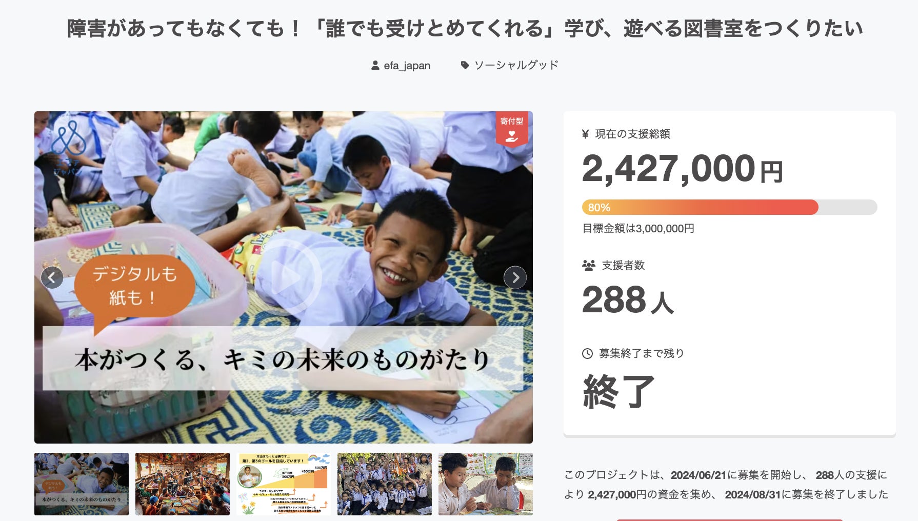 おかげさまで288人の方々から、2,427,000円のご支援をお寄せいただきました。