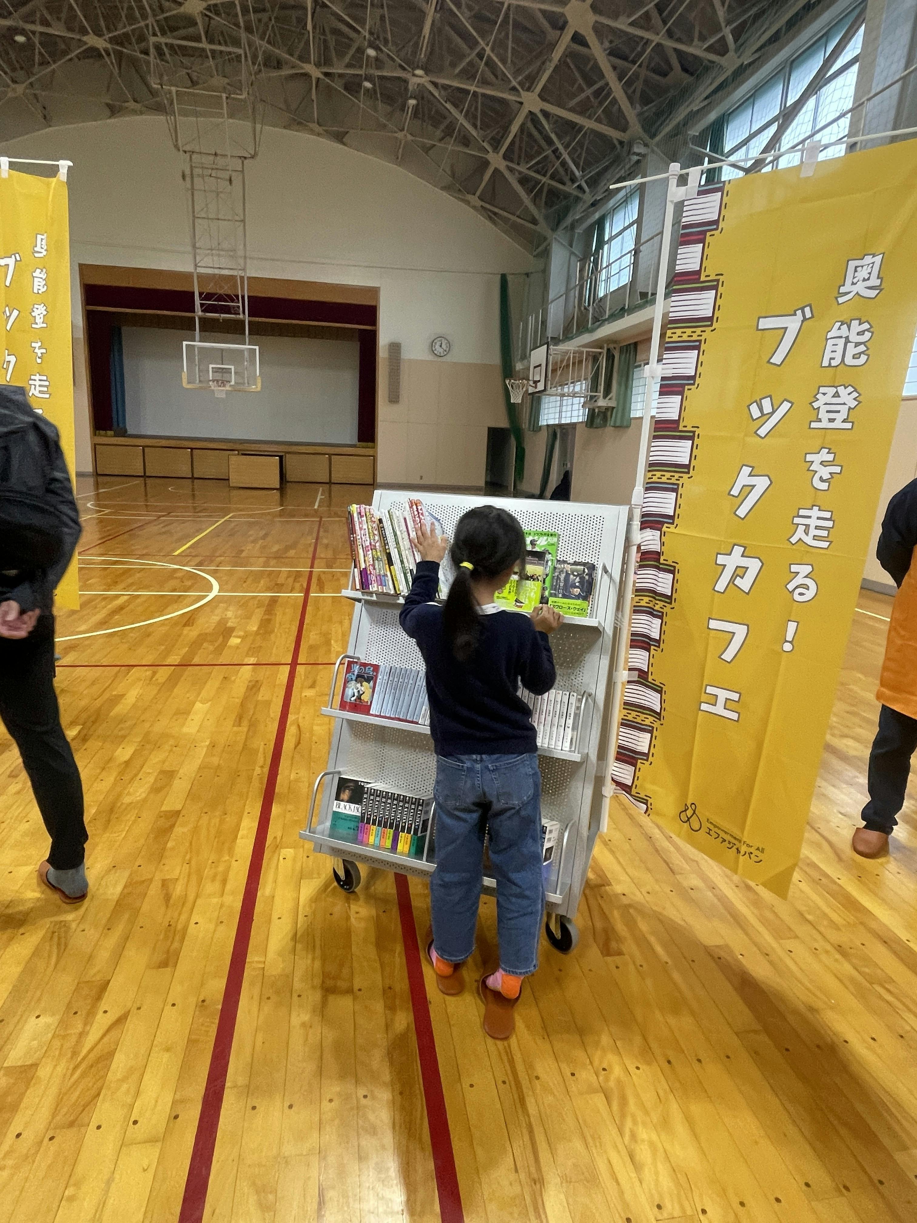 この日は、急遽小学校の体育館でブックカフェをオープンすることになりました。