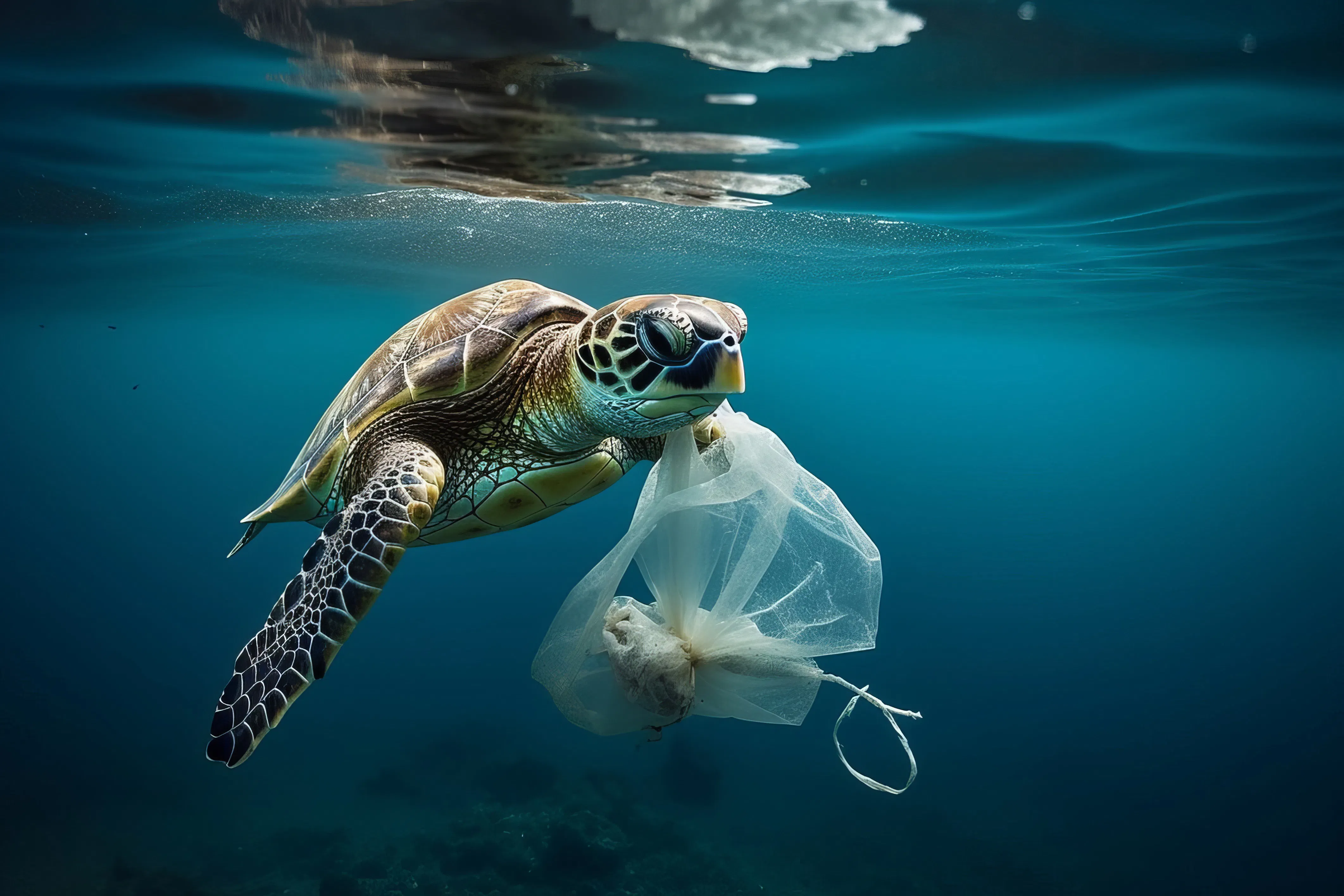 写真は、クラゲと間違えてビニール袋を食べているウミガメ