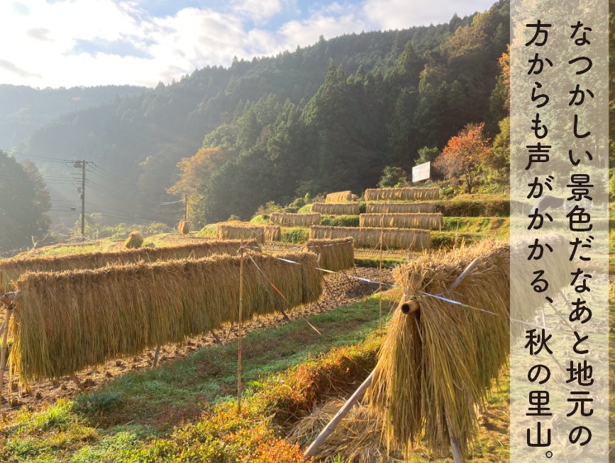 山から流れ込む澄んだ水に恵まれ、太陽の光をいっぱいに浴びて育ったお米は、仕上げも秋風に吹かれながらの天日干しです。