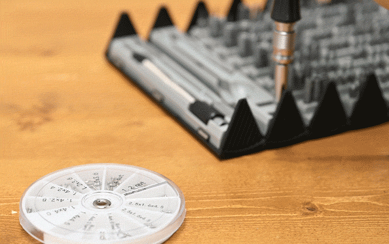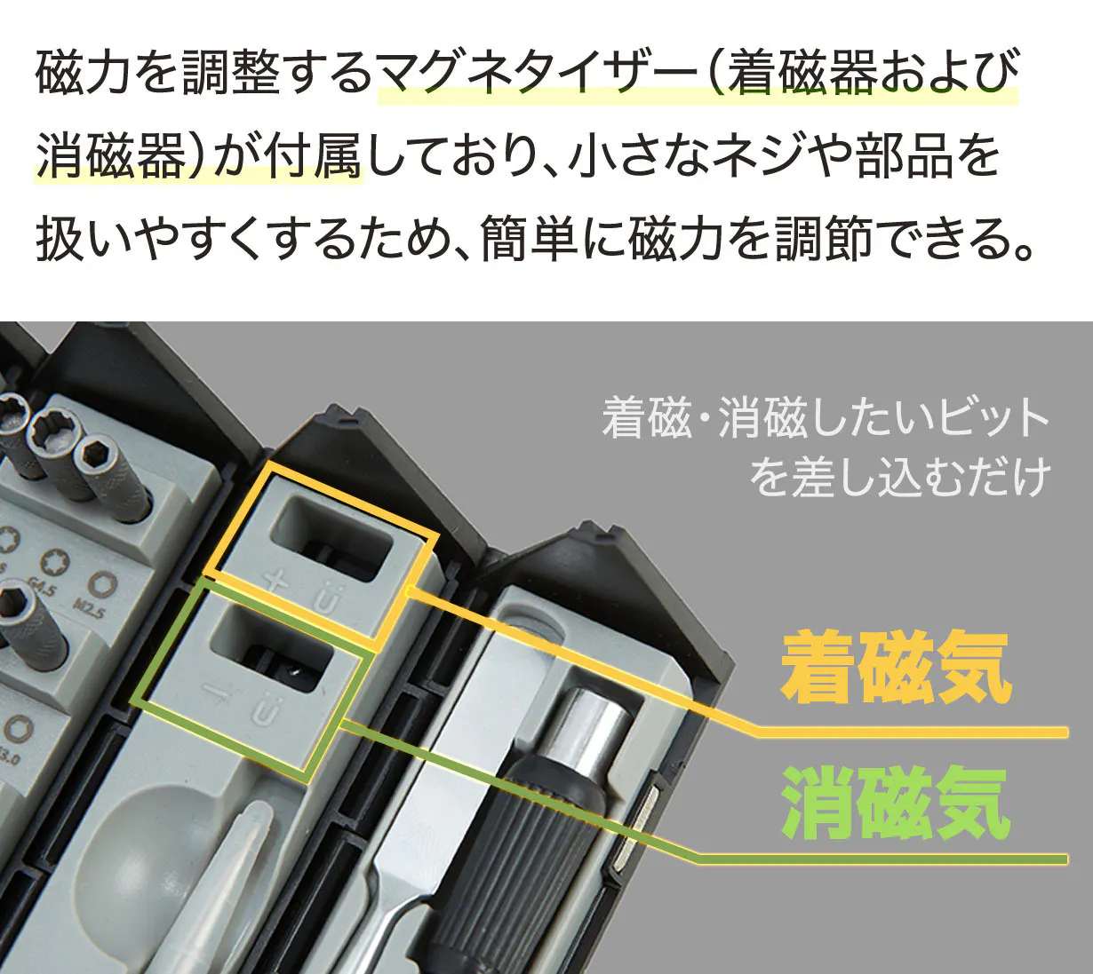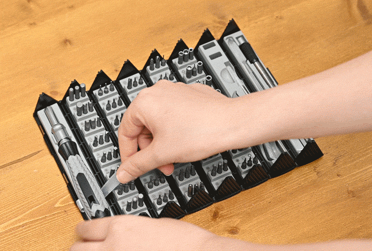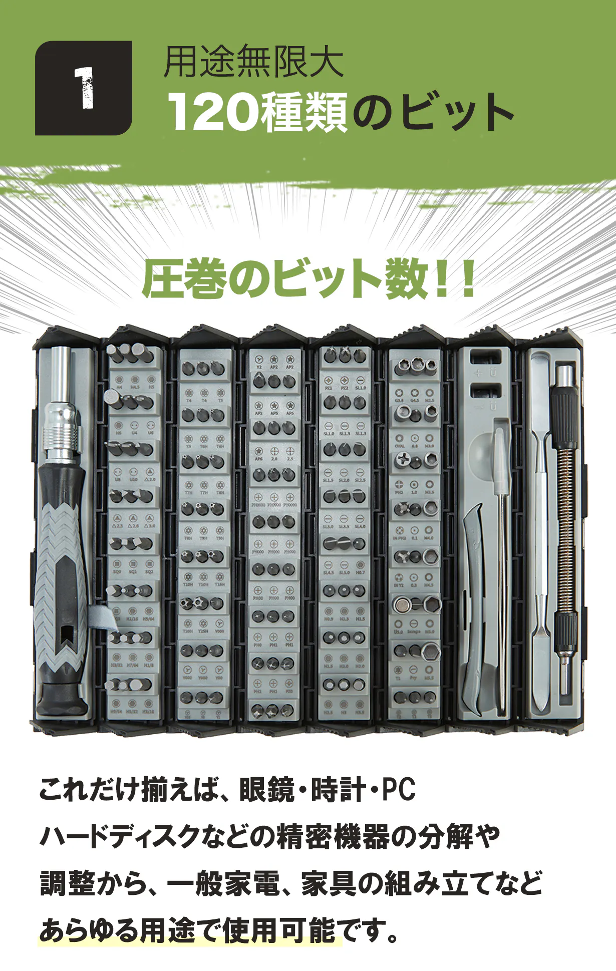 A:本製品には120個のビットが付属しています。収納用の差し込み穴の下にサイズと形状が印刷されているので、直感的に収納できます。
