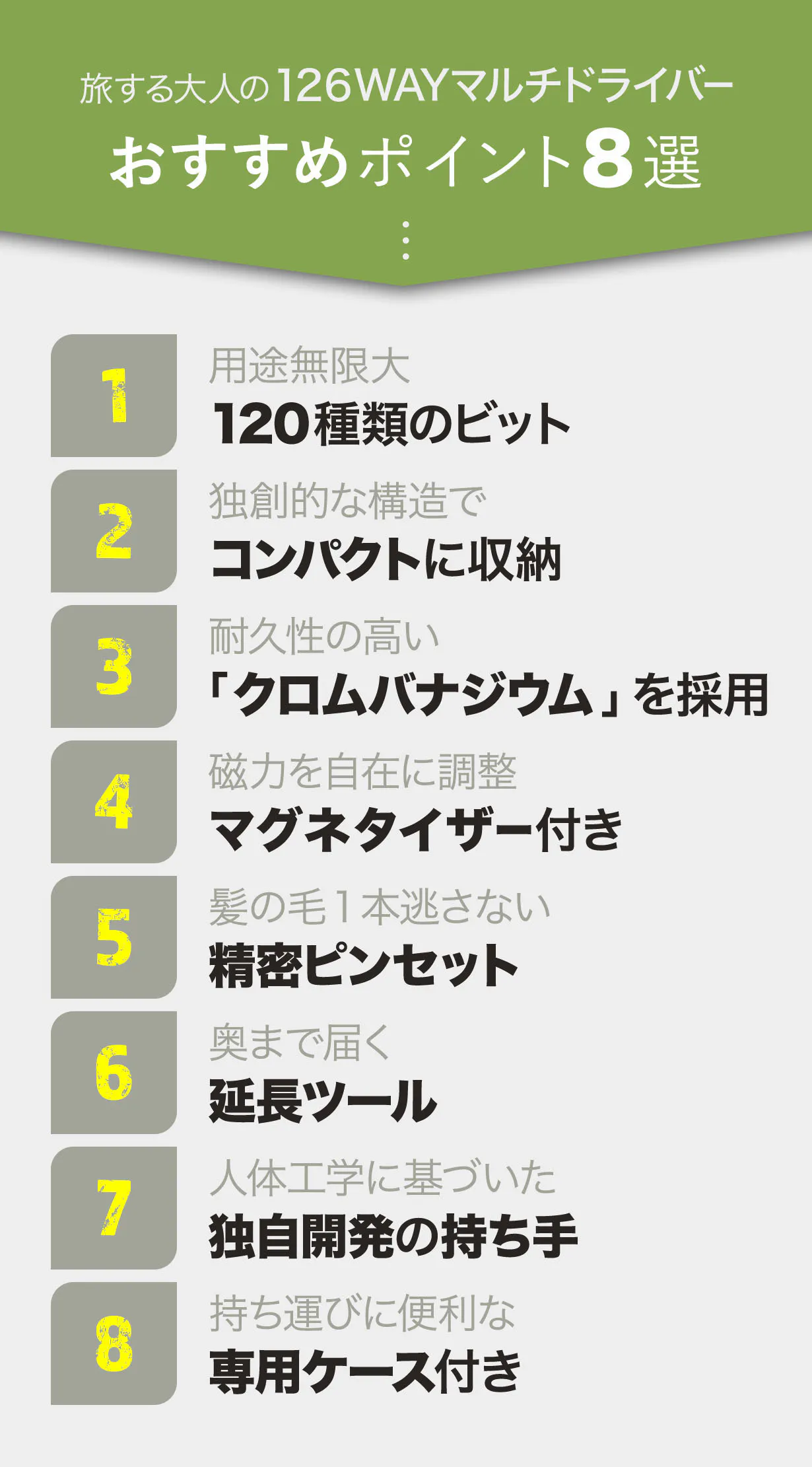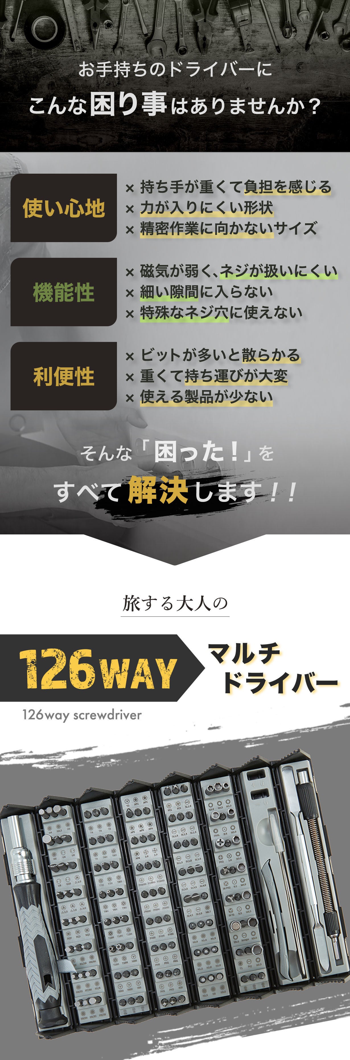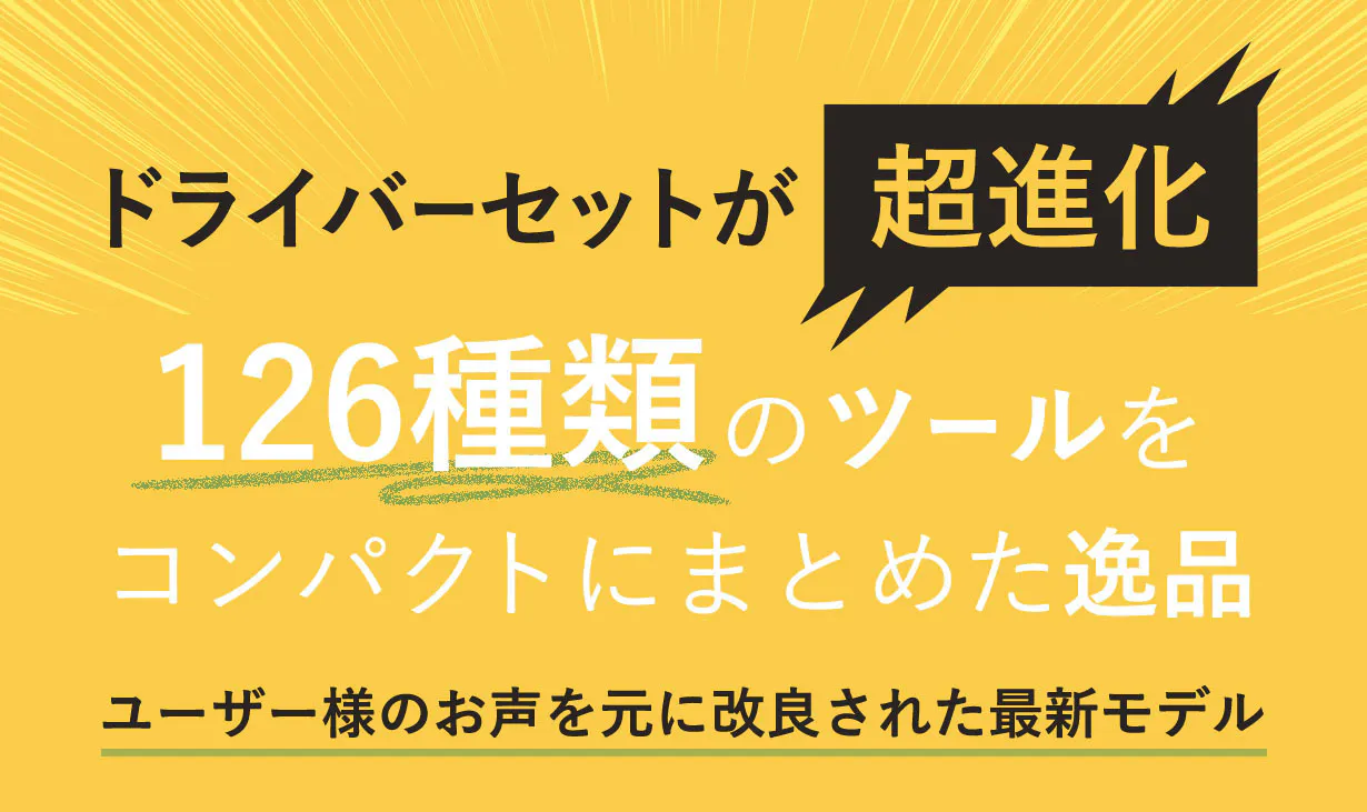 【免責事項】本製品使用によるトラブルについては一切の責任を負いかねますので、ご了承ください。開発中の製品につきましては、デザイン・仕様が一部変更になる可能性もございます。 クラウドファンディングの性質上、以上の注意点につきまして予めご理解とご了承をいただいた上でご支援くださいますよう、何卒よろしくお願い申し上げます。 最後に、本製品を受け取られた皆様に喜んでもらえるよう、「旅する大人の126WAYマルチドライバー」チームメンバー一同、心を込めて対応して参りますので、 応援の程、よろしくお願い致します。
